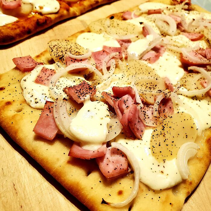 A fridge and pantry dive if there ever was one! No energy to cook tonight. Canadian bacon, fresh Mozzarella, potatoes (canned; don’t even remember buying them), and onion. All on top of a surprisingly decent Aldi flatbread crust. BF had the same but added tomato sauce to his.