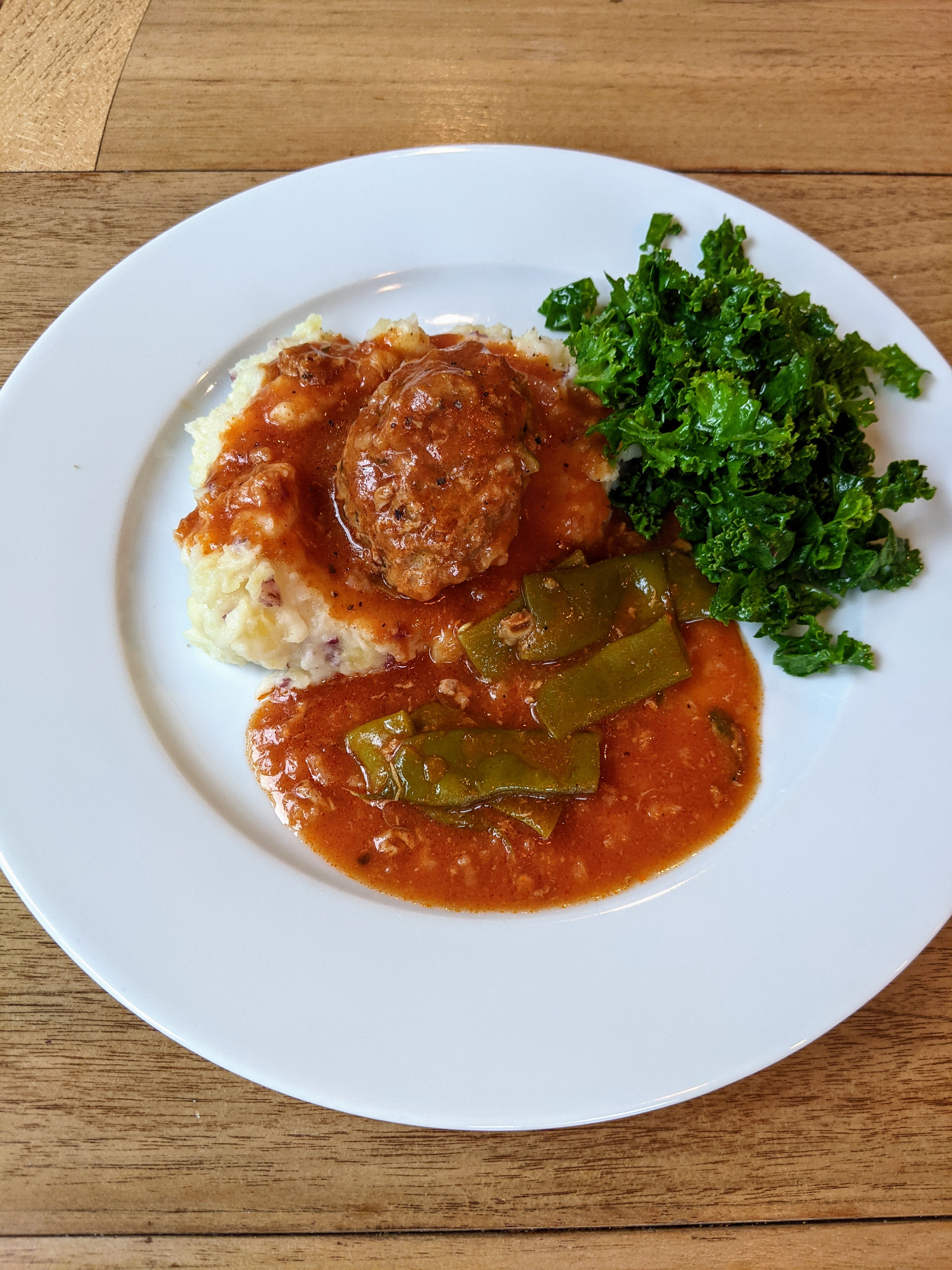 I made turkey porcupine meatballs using this recipe. I added bay leaf, minced garlic, and onion to the sauce (which I doubled) and a little bit of breadcrumbs, milk, and parsley to the meatballs. Plus a whole grated zucchini. Simmered runner beans in the sauce (18 min at high pressure, 15 min natural release). Served over CSA potatoes, which were too waxy to mash properly. Still tasty. Lemony kale salad on the side.