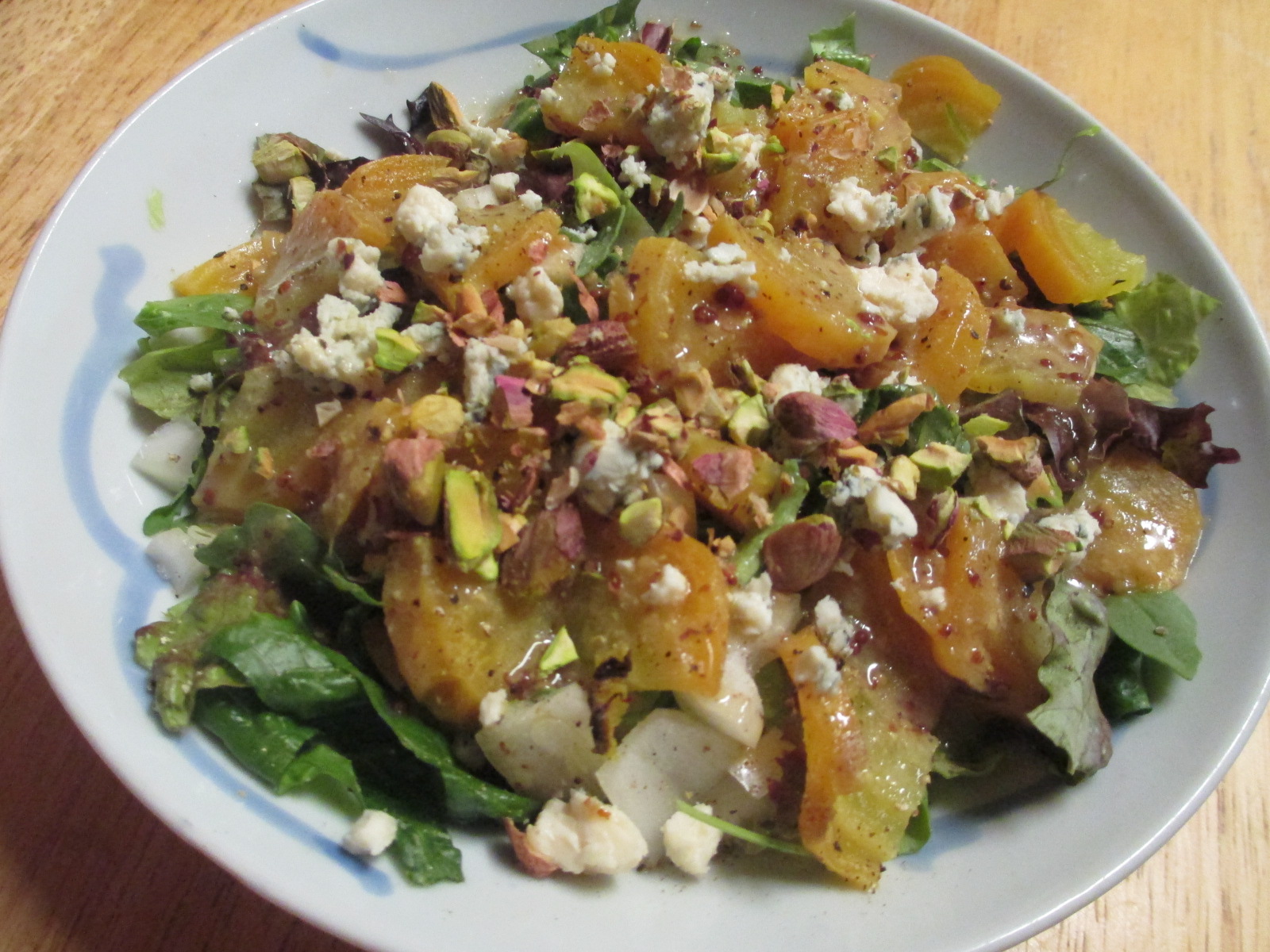Saturday night I had a shrimp salad. Tonight boneless pork country ribs. Braised in beer with a big glug of KC Masterpiece BBQ sauce added after they were tender. Sides were doctored up Bush’s grillin’ beans and a salad of mixed greens, golden beets, Walla Walla sweet onion, sugar snap peas, bleu cheese, pistachios and honey mustard dressing.