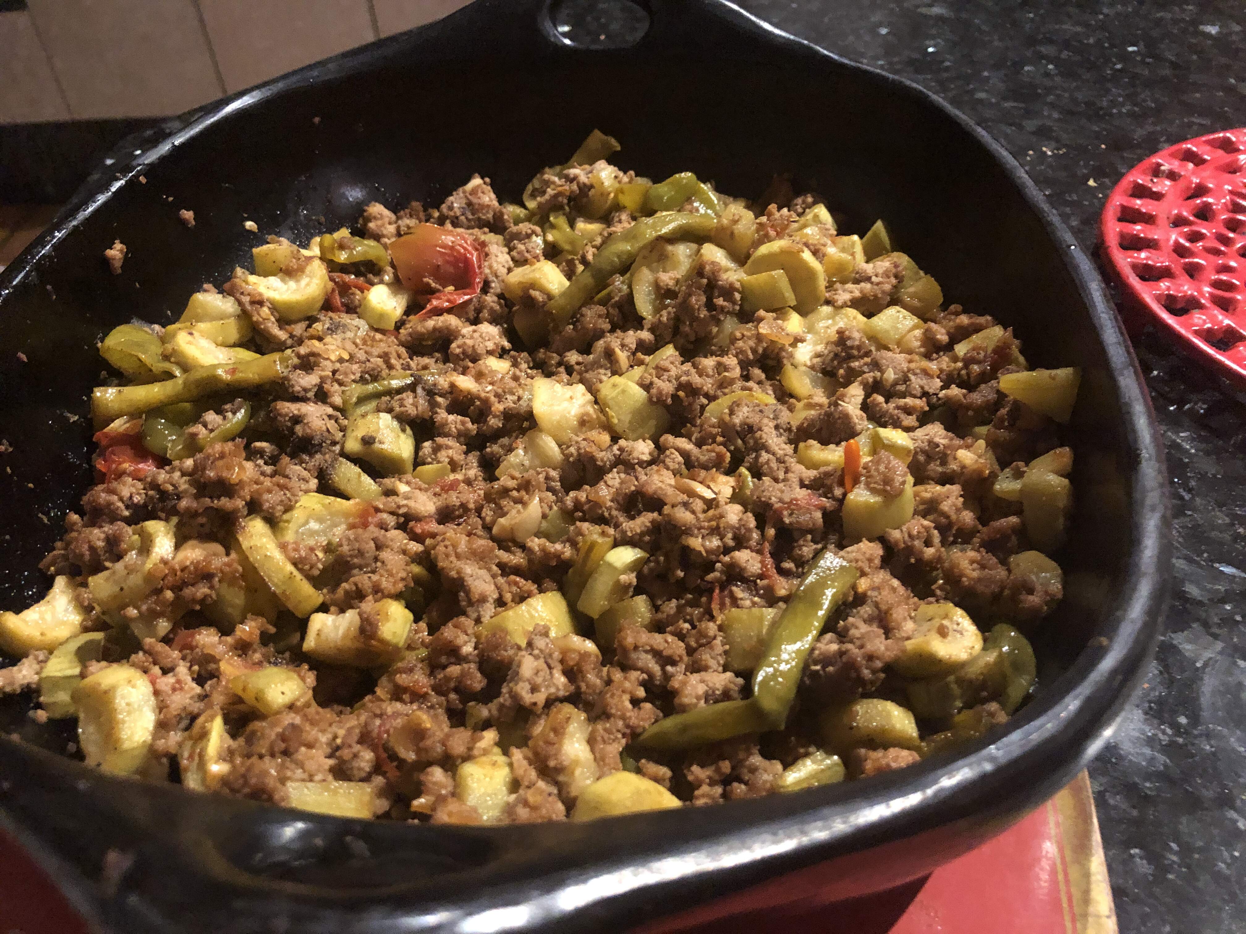 and my Chinese version of Cucuzza stir fried with caramelized onions, garlic, garden purple bell peppers, tomato and chicken breast with some store bought Chinese rice crepes. ( not easily visible )