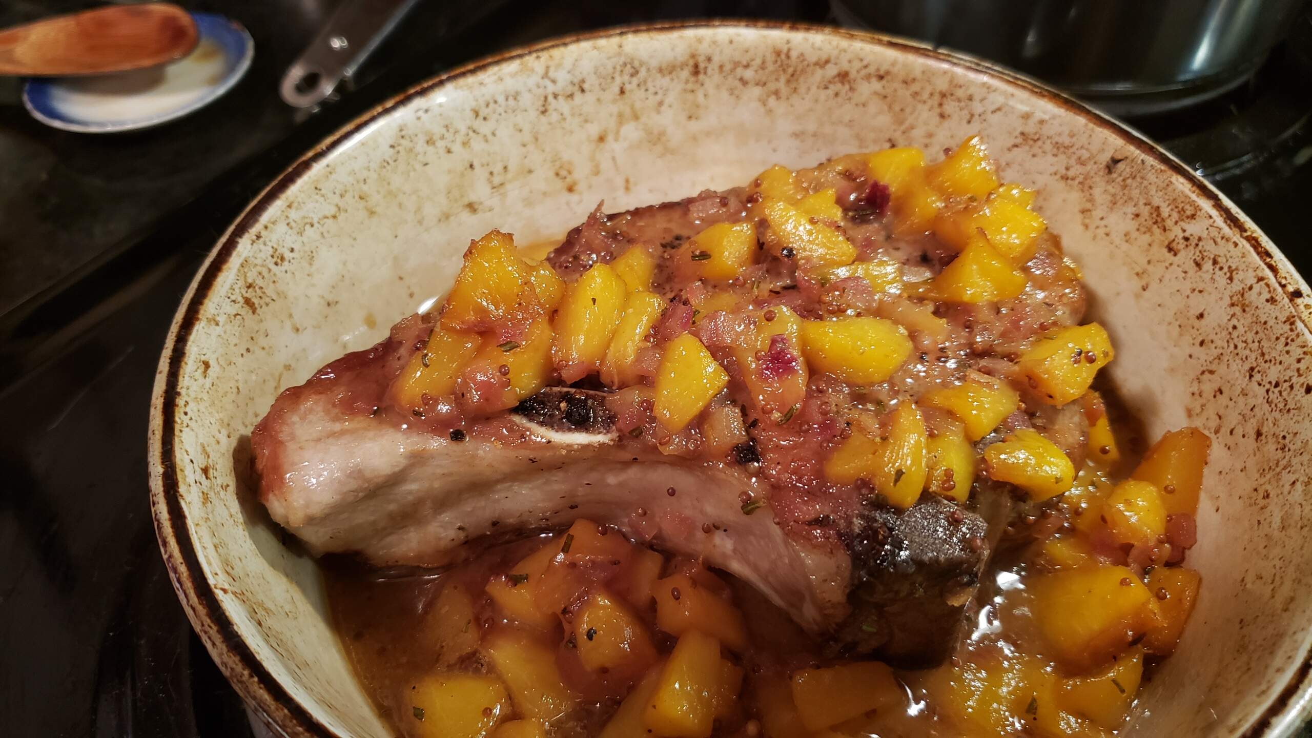 Seared pork chop with a rosemary, red onion, and peach “sauce” patterned after the linked New Zealand link was dinner, along with toasted Israeli couscous and steamed green beans.