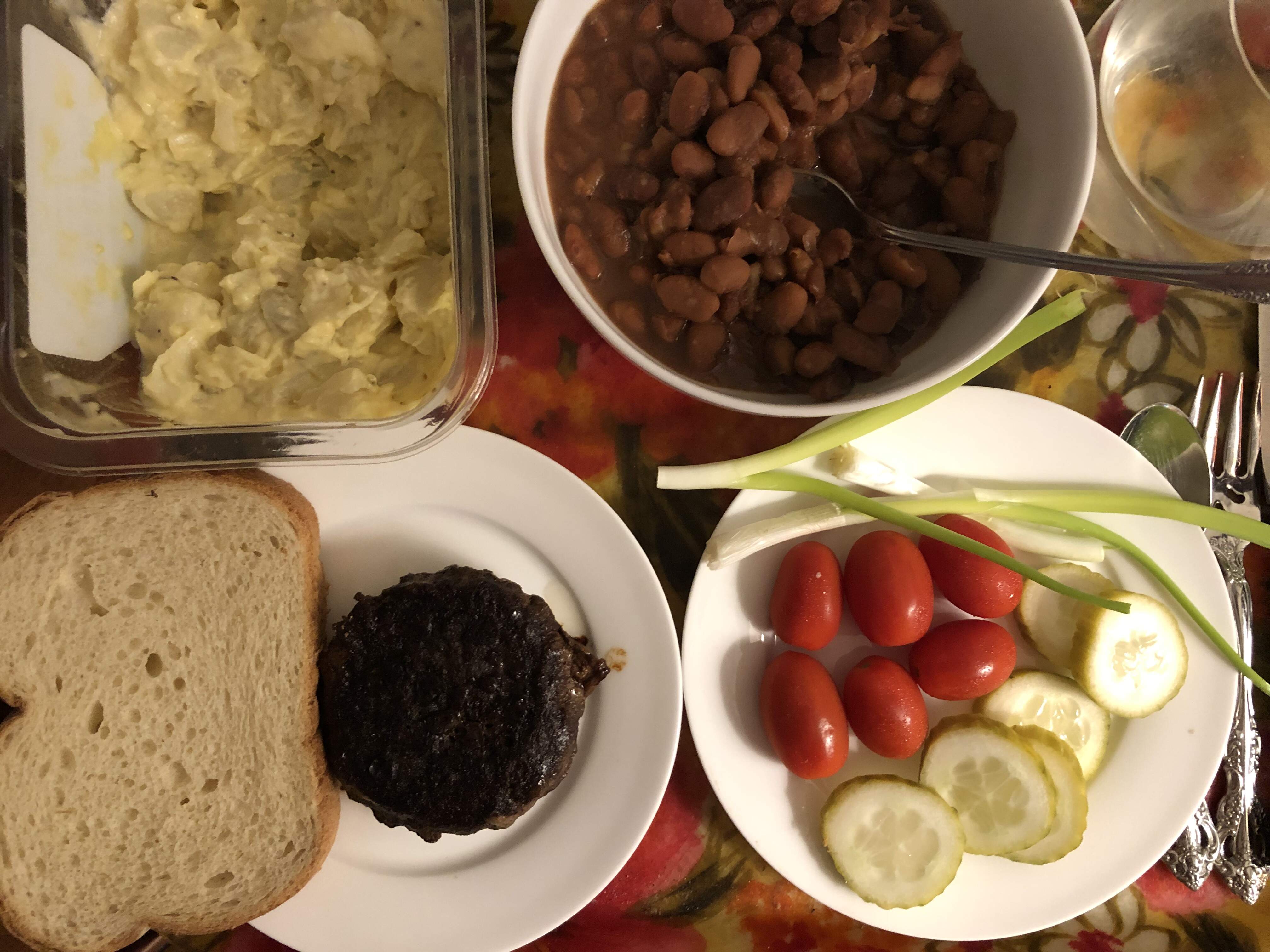 Last night had a nice dinner, but wish I had made cornbread to go with the meal. Oh well. And as pistachiopeas stated, “want to use up things we have rather than….” Purchased potato salad, IP Pinto beans, sauteed hamburger patty, green onions, cherry tomatoes and cucumber slices.