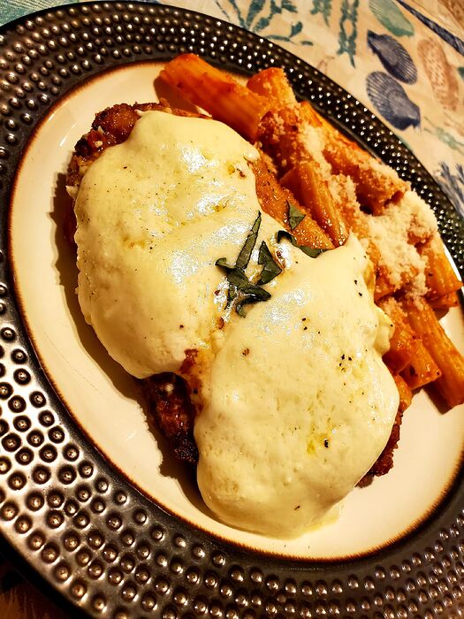 Had one of my lectures on local mob/Prohibitiom history this evening. All that talk about mobsters put me in the mood for something Italian. So I came home and whipped up Chicken Parm. Fresh Mozz made all the difference.