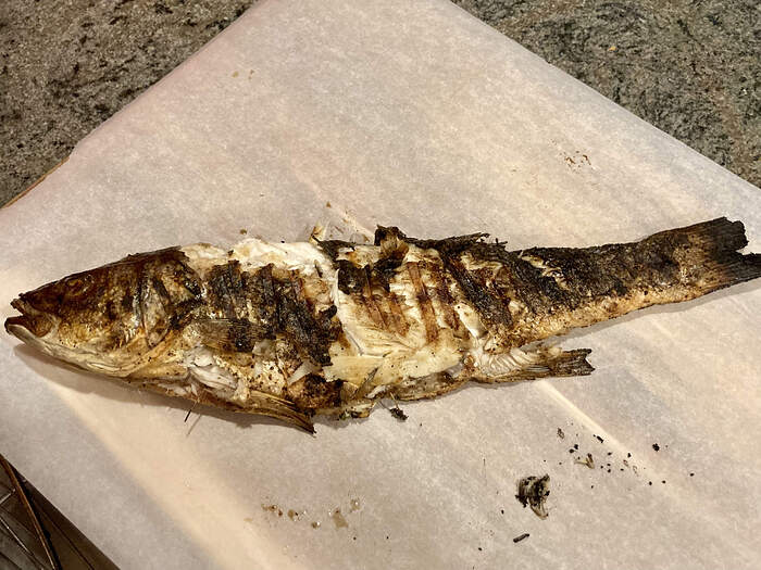 Still nice enough to grill, so I picked up a 2.5lb branzino at the local fishmonger today ā simply stuffed it with thyme & brushed with lemon pepper-seasoned olive oil. Came out nicely, save for the loss of skin the fish suffered after being handled by my PIC ![]()