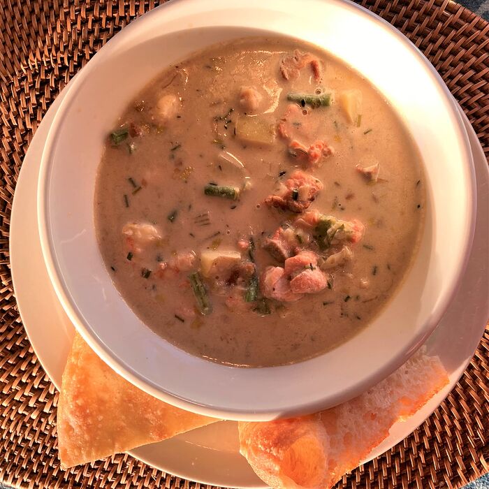 Casserole of pasta and shredded, poached chicken breast with a sauce made from a few glasses of roasted red pepper, parmesan, thyme, shallots, garlic and parsley and dollops of chèvre and ricotta