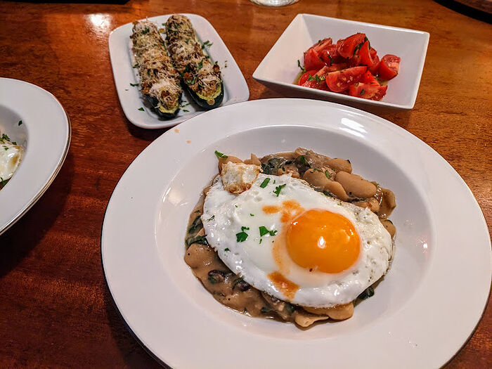 BF made a bean (Rancho Gordo Coronas) soup for us tonight - with shrooms, spinach, and an egg. Also, zucchini boats with the zucchini filling and garlic, topped with a little toasted breadcrumbs and parm regg, and a little tomato salad. All delish and warming on a chilly May night on which I had to work late.