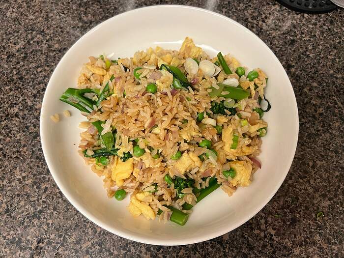 Did reverse sear method (Kenji, Serious Eats) on a huge thick steak for the first time. My technique needs a bit of work (more oven time, less stovetop time) but it was delicious with buttered rice and peas and kimchi. Tons of leftovers.
