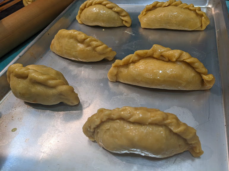 And here are our salteñas from last night. We made the dough, rolled it into balls, let them rest in the fridge for 3+ hours (should have been overnight but we wanted them for dinner last night), then rolled them into disks. Filled with a large tbs. of the beef stew (beef, onions, potato, peas, carrots, ground garlic, raisins, aji panca (a Peruvian chili paste), paprika, cumin, oregano, sugar, beef broth), and then assembled, adding a slice of hard boiled egg and a kalamata olive to each, before closing and braiding. My braiding skills pale in comparison to the BF’s, but no matter. They get glazed with an egg wash and then baked for 20 minutes at 525 (i think our oven isn’t hot enough) and didn’t get nearly as dark as we wanted (the braid should be almost black!), but they turned out delicious, I have to say. The dough isn’t exactly right still, and the filling should have been a lot juicier, but we’re getting closer and closer, and we’ll keep trying! In the meantime, we were very happy with these. Three were dinner last night (oddly, in Bolivia, salteñas are only eaten mid-morning to early afternoon, never at night. not sure why!). We froze the rest and a few will go to my sister’s house.