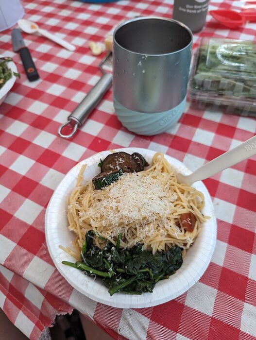 Camping dinner! The usual suspects plus garlic spinach and zucchini. Friends made the kale salad and homemade sourdough.