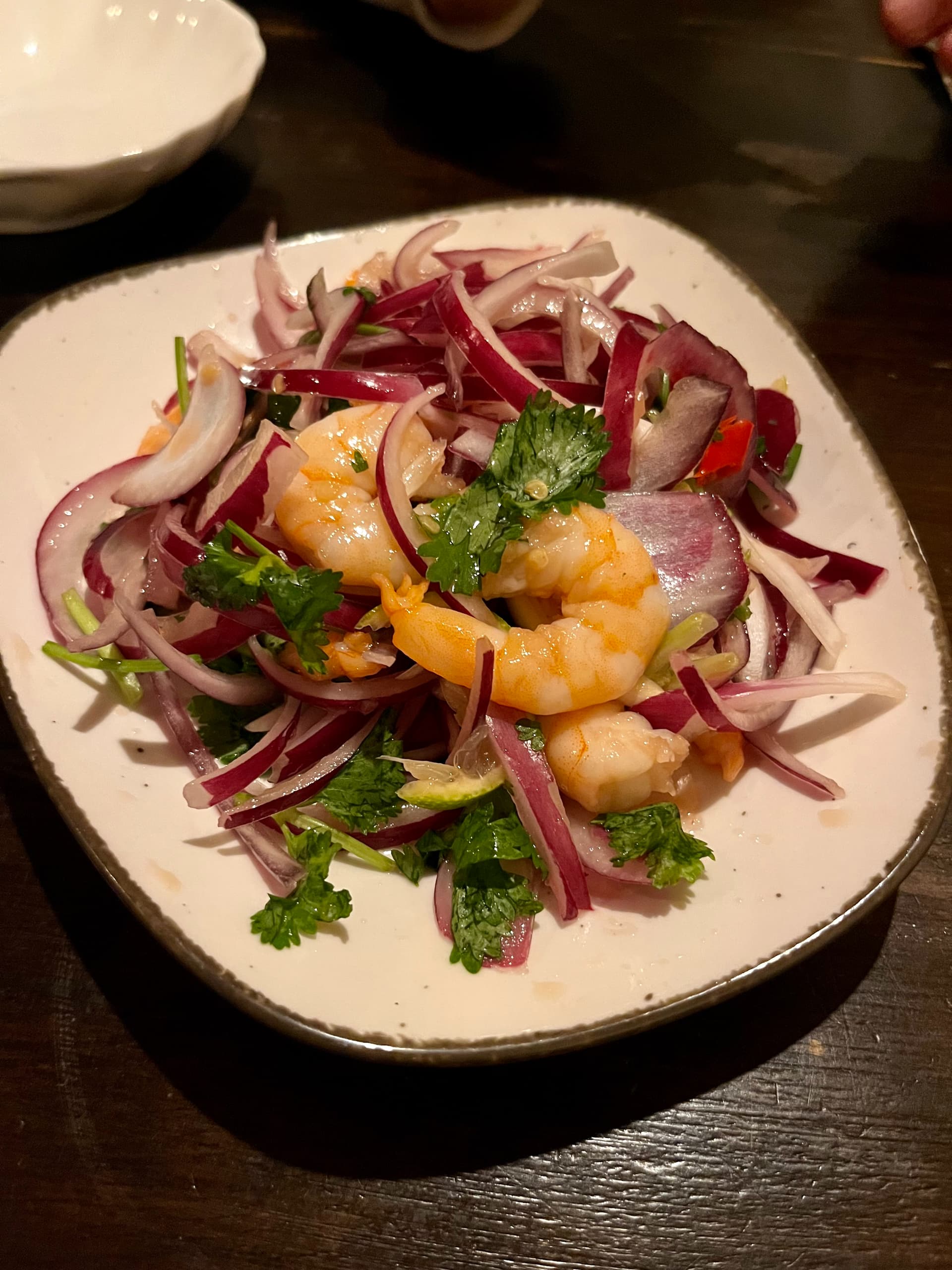 Last night we were hoping to get into the Japanese brasserie we stumbled upon at the beginning of our stay, but there was a waitlist that never materialized into a table, so we hoofed it to a Xi’an place near us with hand-pulled noodles. We split ‘lemon shrimp’ as an appetizer, which were nice & refreshing & had a lil kick to it. The abundance of red onion was puzzling, however.