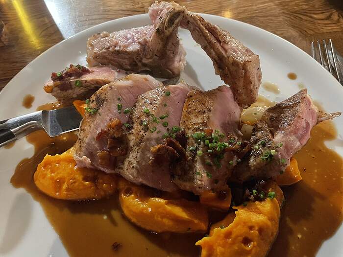 Llano seco pork chop, brown butter yam puree, cipollini onions, quince mostarda, bacon jus