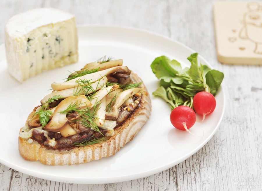 Grated blue cheese (melted in the oven) and topped with king trumpets and golden enoki (I think).
