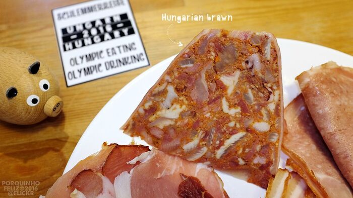 Hungarian brawn. I love it. Luckily I can get it from a Hungarian stallholder at the market. Garlicky, paprika rich, has rinds and other things we shall never know what exactly in it. There’s also a version with blood. Maybe I should try that next.