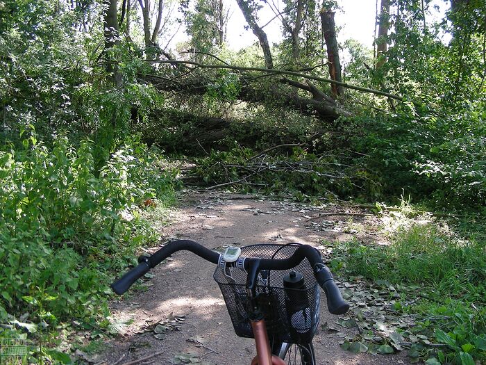 A dog walker and my bike for scale. Fallen trees on bike paths are not priority, but cyclists pay taxes also!