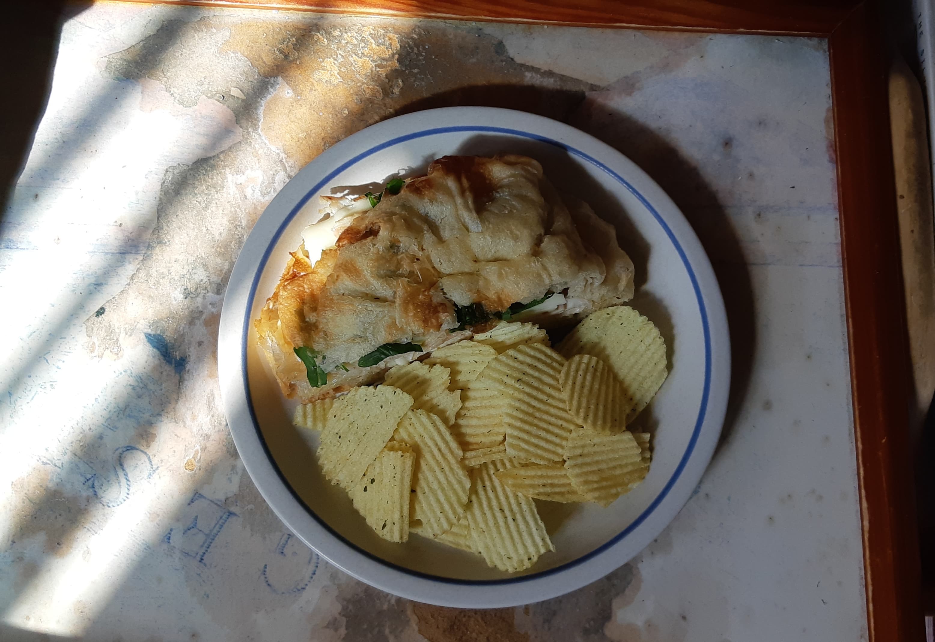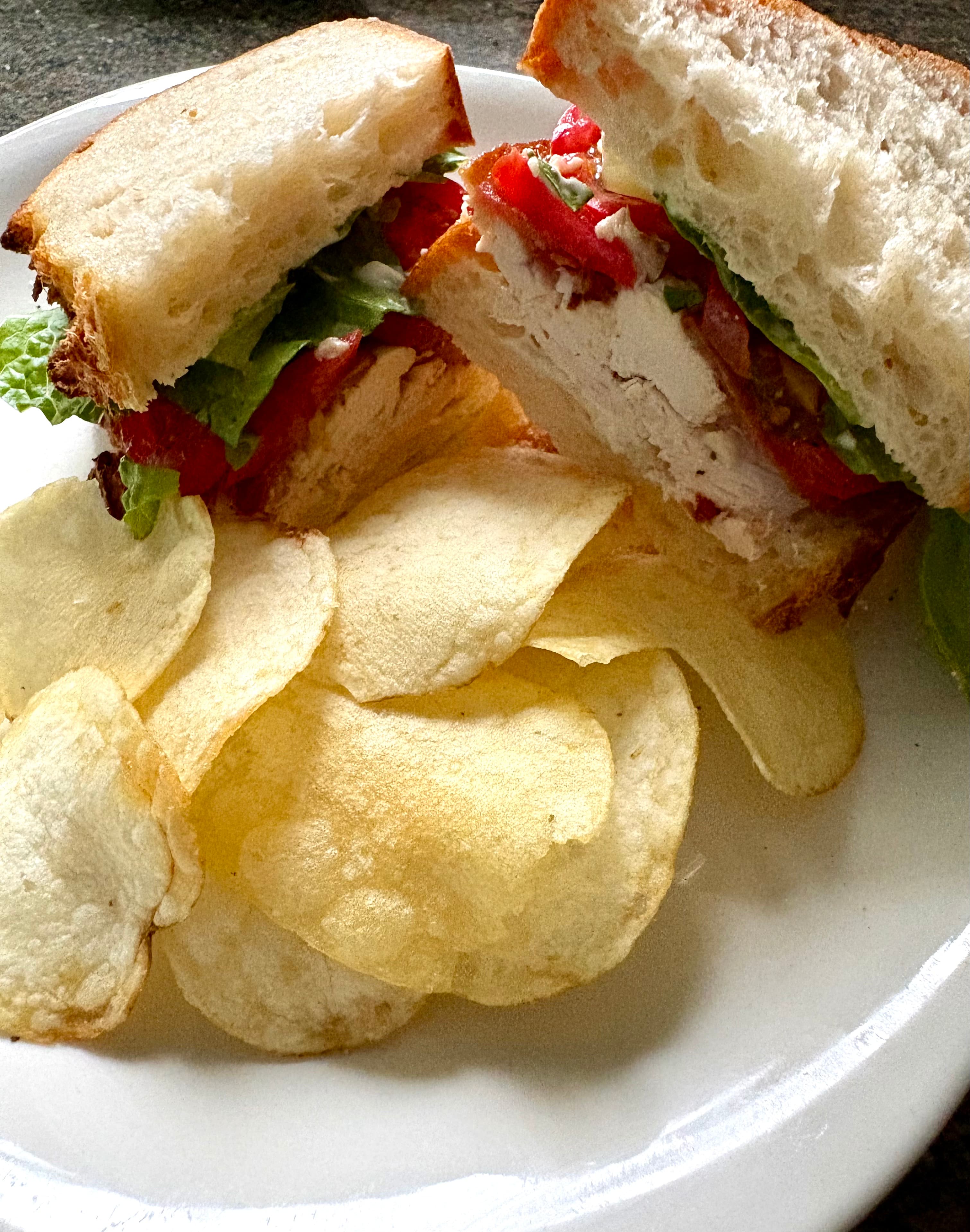 White meat/crispy bacon/tomato/lettuce/Hellmann’s mayo on uber fresh, untoasted pane Pugliese bread with a side of plain chips.