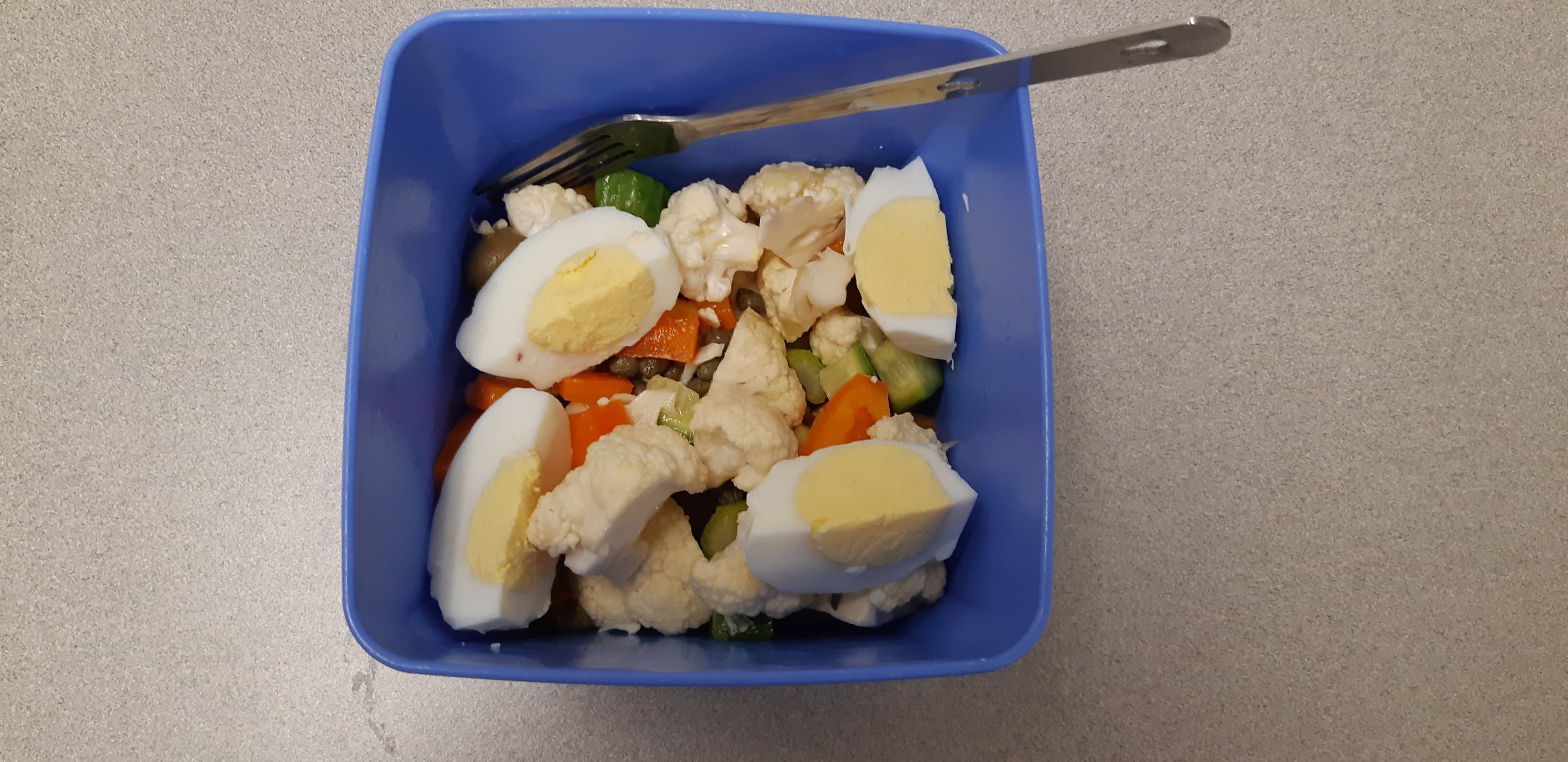 Lunch today was a cauliflower salad with celery, orange pepper, cucumber, piemento stuffed green olives, capers and hbes.
