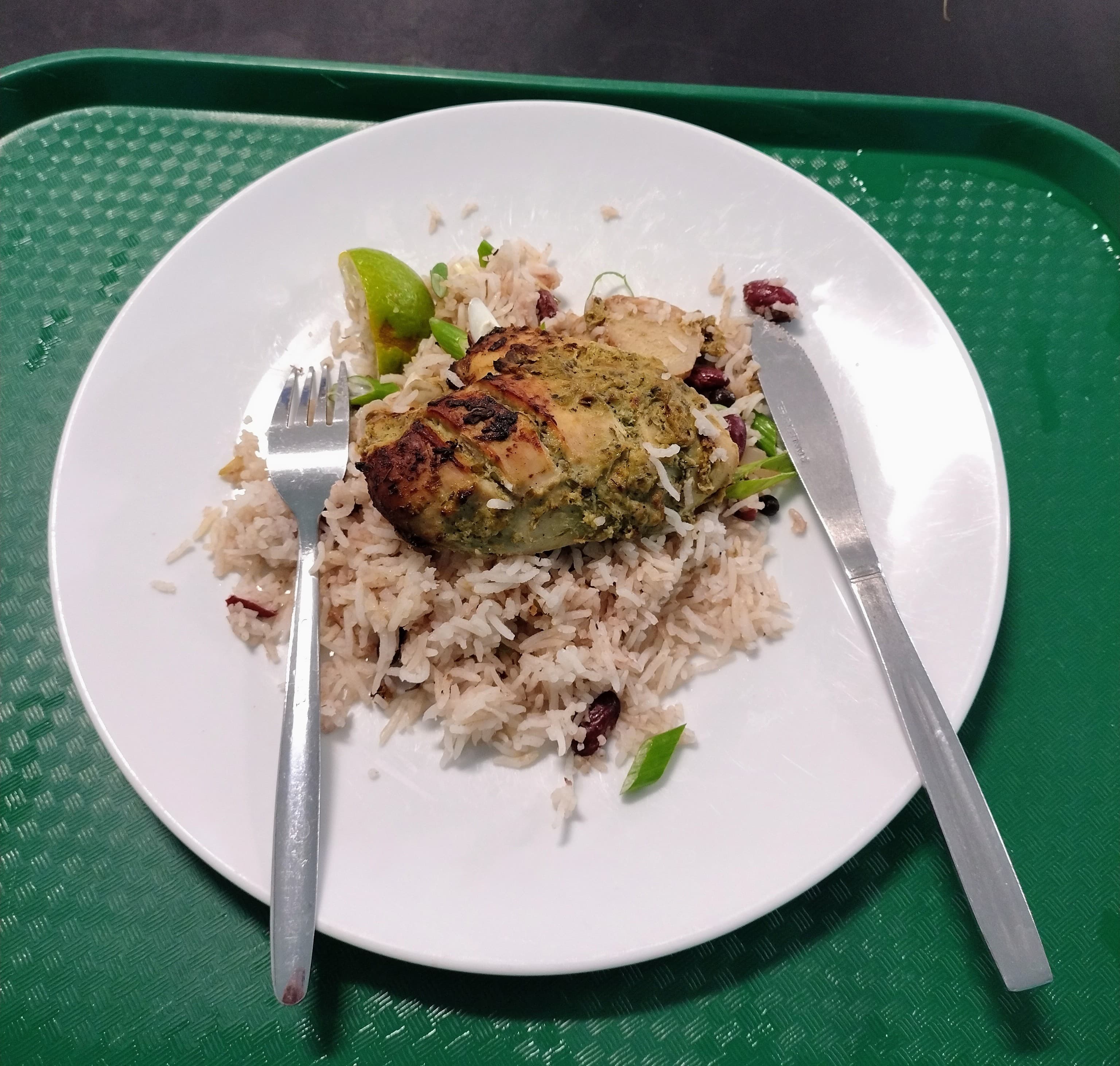 ‘Jerk chicken, rice and peas’ from the hospital canteen. I put those words in quotes because it wasn’t, really. Perfectly serviceable plate of a chicken breast marinated in a herby yogurt-based marinade, with a spicy rice. I think if any actual Jamaicans came across this they would be very puzzled. The server included some massive bits of ginger in my serving of rice, which I was annoyed about, but she was busy chatting with her pal and I was tired, so I didn’t complain.