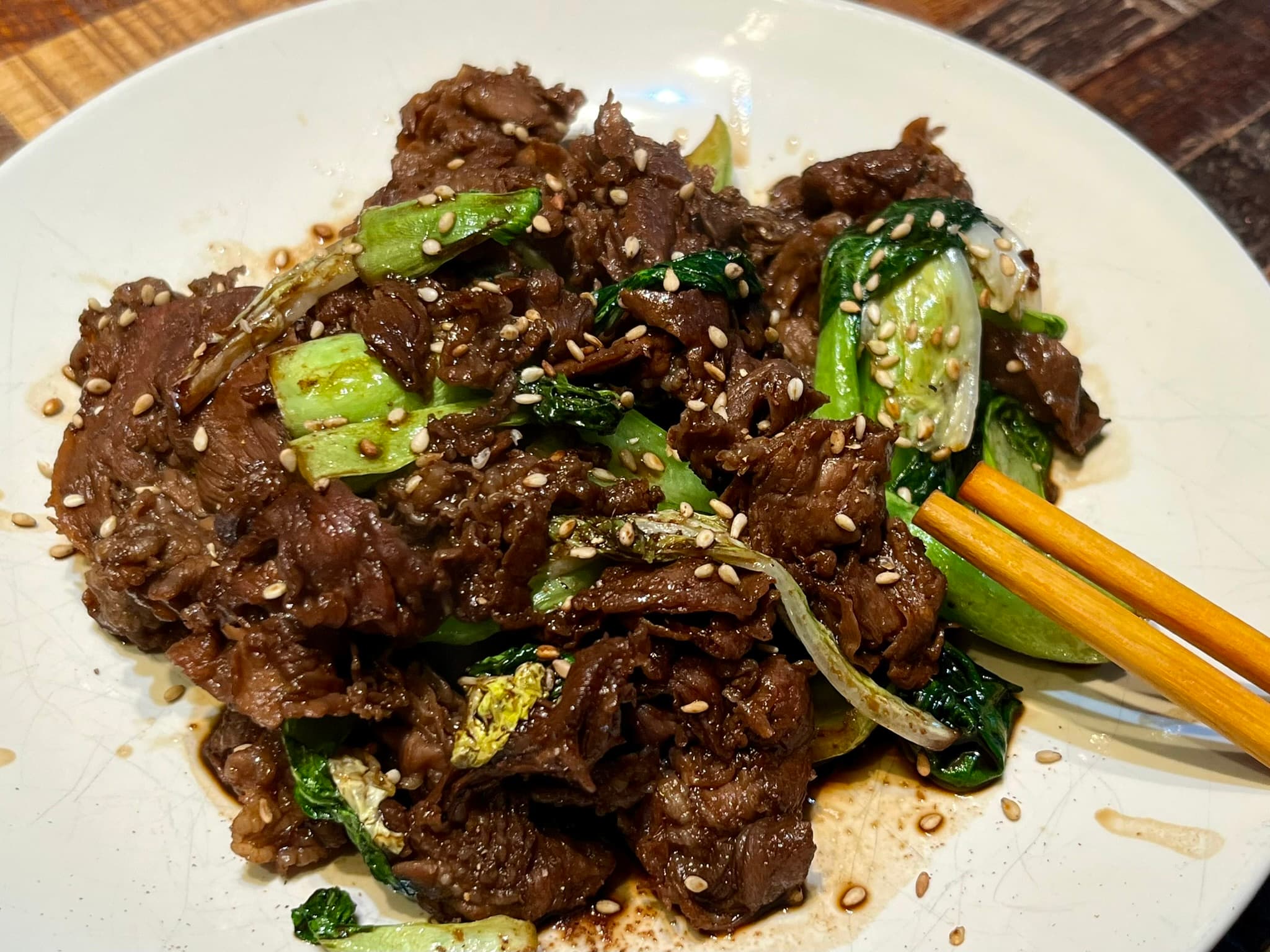 Fridge clean-out lunch with the leftover shaved (shredded would be a more appropriate term, TBH) lamb shoulder from TJ’s, plus a few leaves of napa and baby bok choy, stir-fried in peanut oil & a drop of sesame oil. I added a little more tamari than I wanted to, bc it shot out like a mofo.