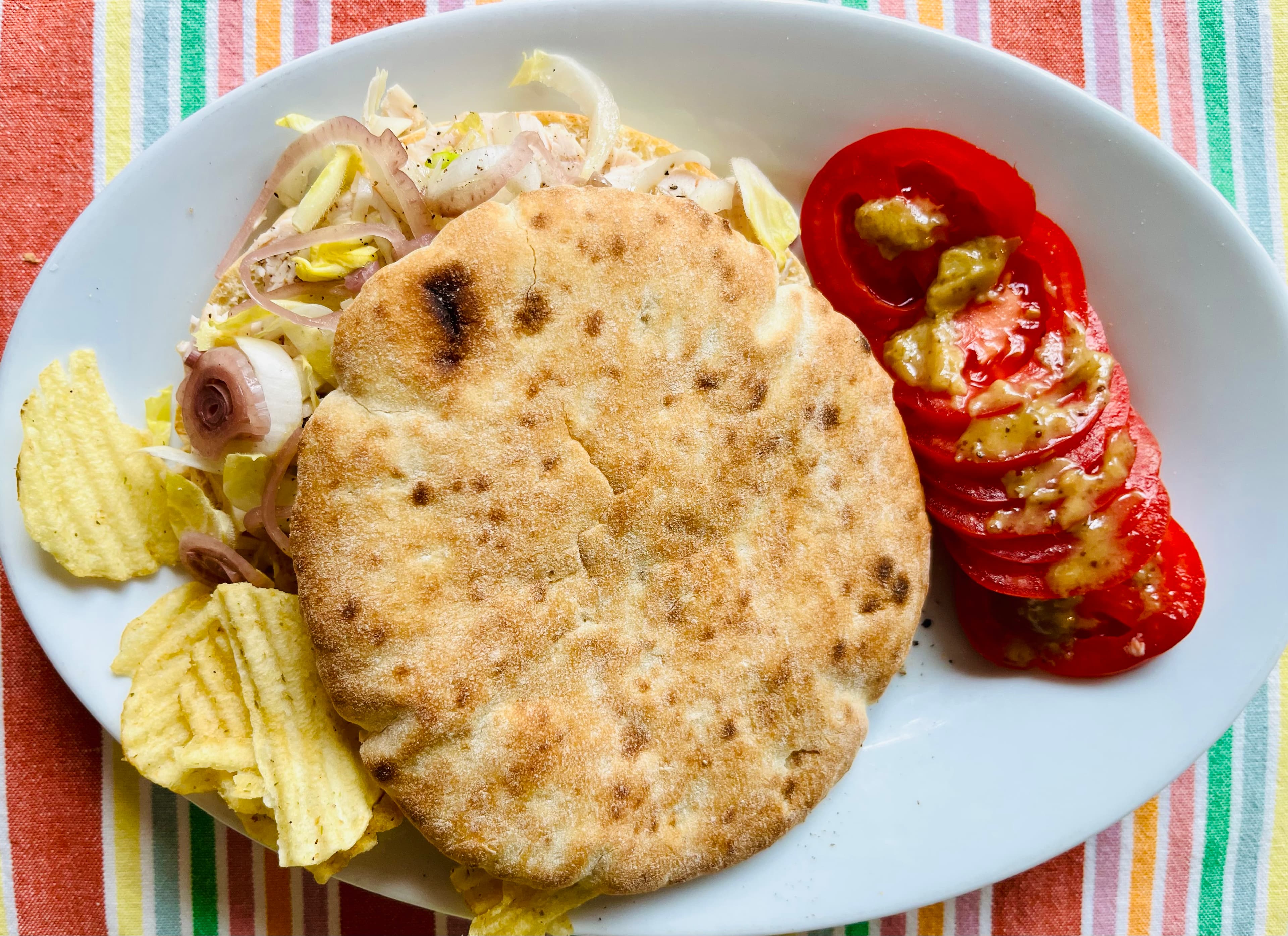 Poached chicken breast on pita, endive, pickled onions, Toum spread on bread.