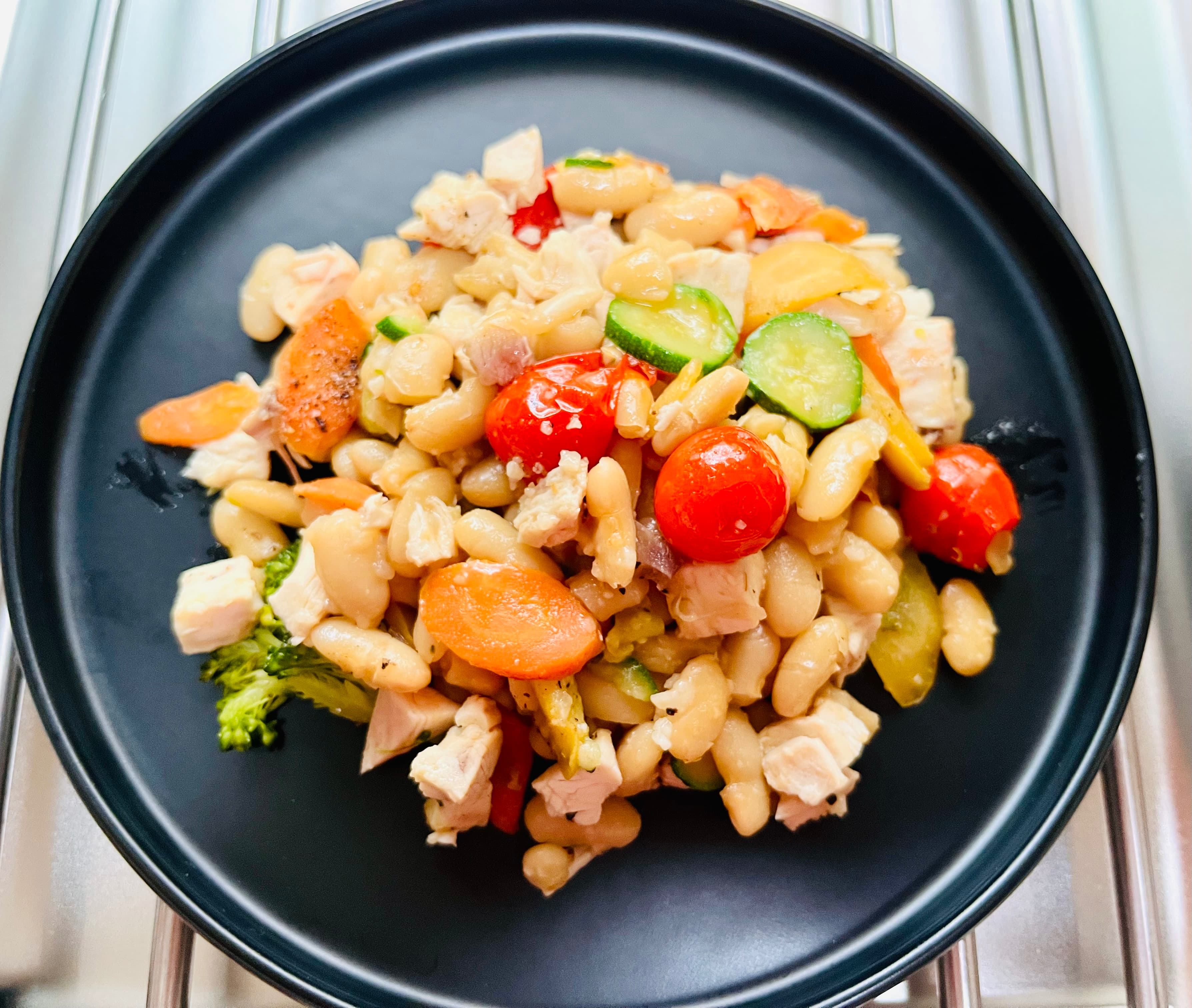 Alubia beans, carrots, shallots, garlic, chicken, zucchini, broccoli, bay, rosemary and thyme..