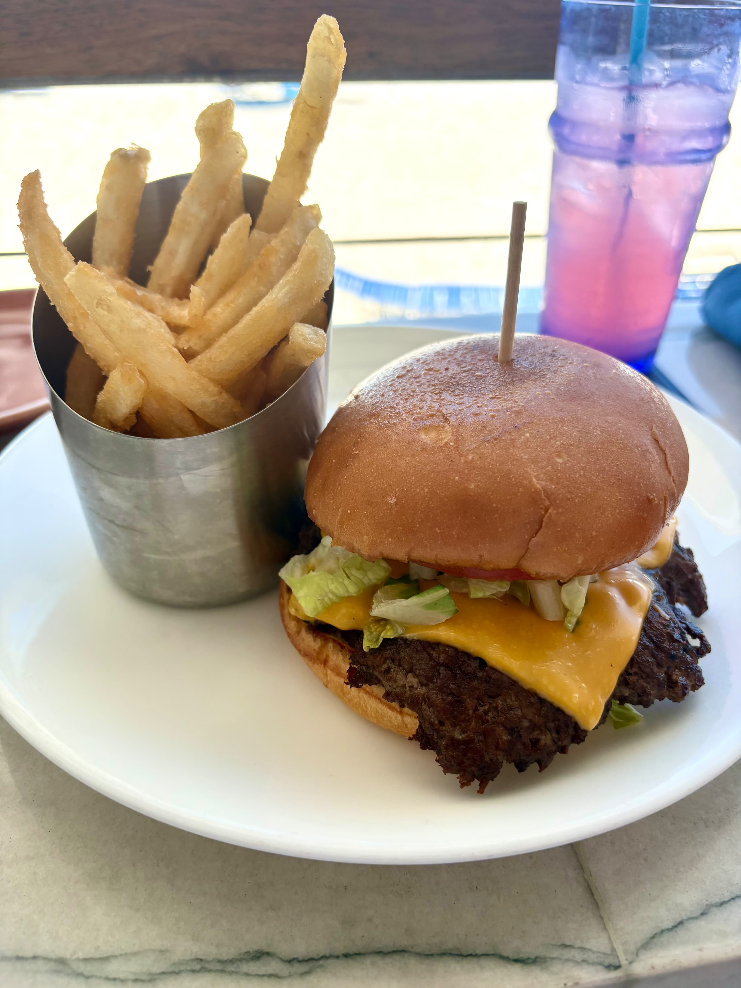 Smashy smash burger for me, sister had fish tacos( no photo) with a side of crispy fries and a pink lemonade to wash everything down. Very good burger and the view was ![]()