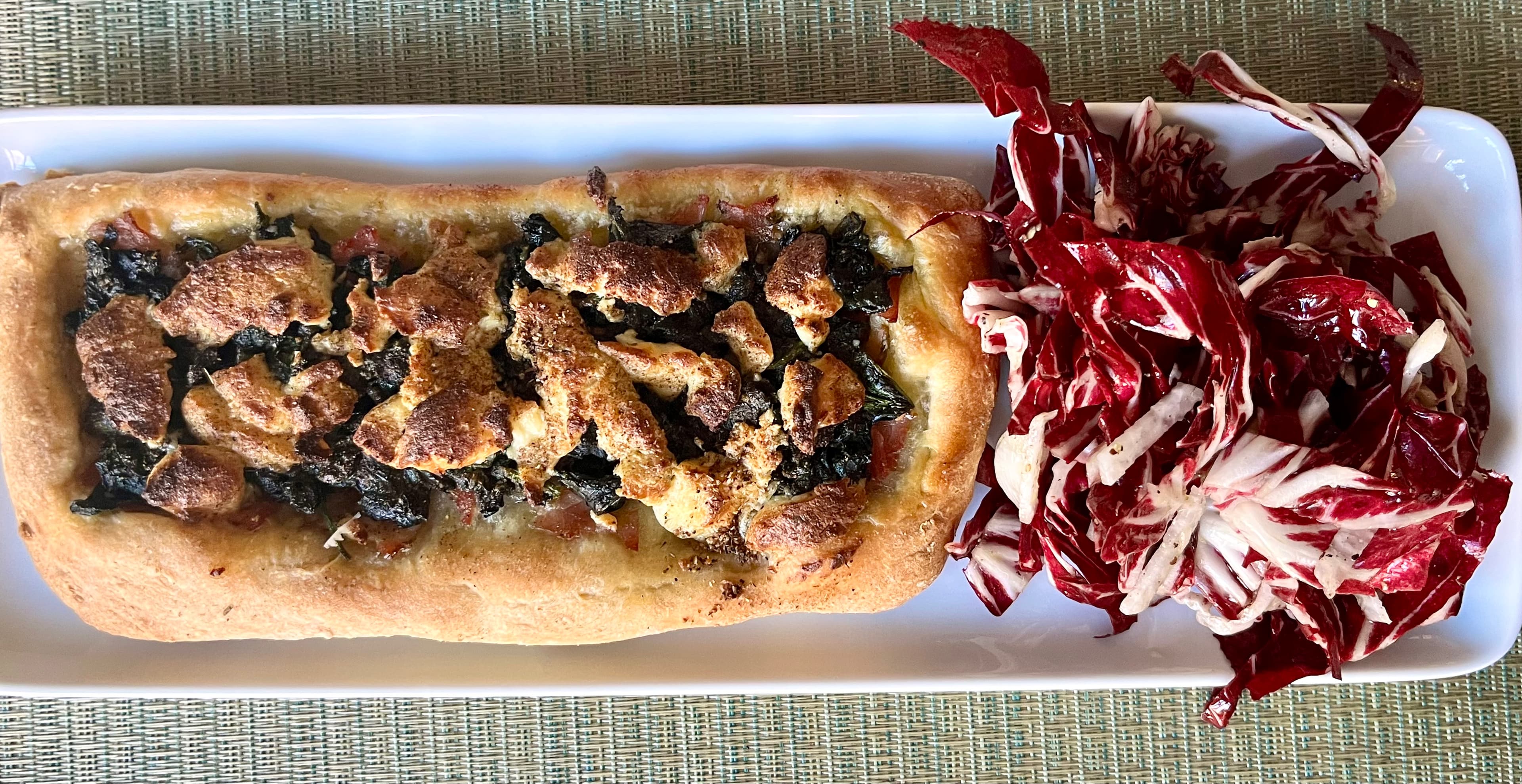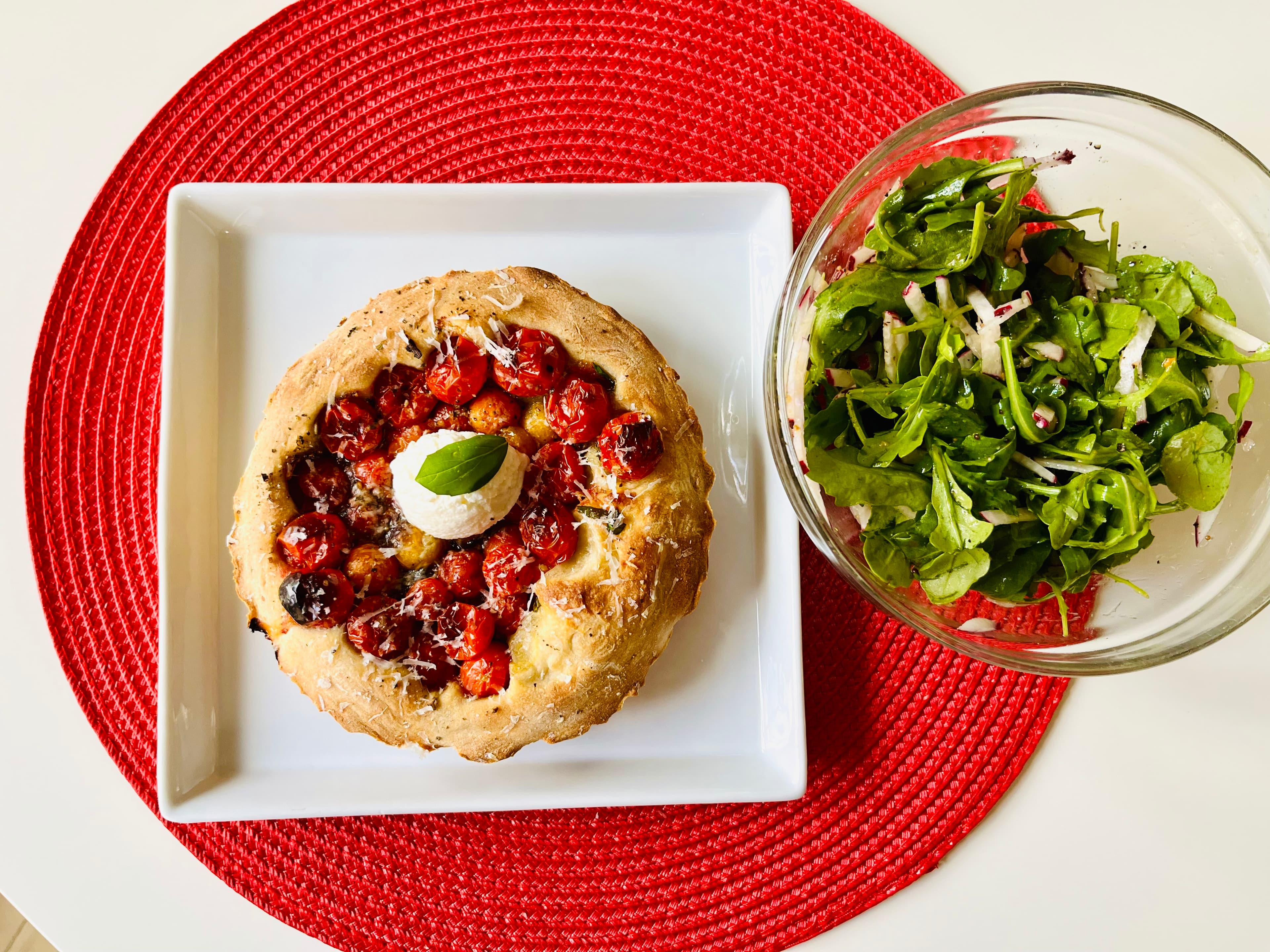 Pizza dough tart, Asiago, basil, mini tomatoes, Italian seasonings, topped with ricotta. Arugula radish vinaigrette on the side.
