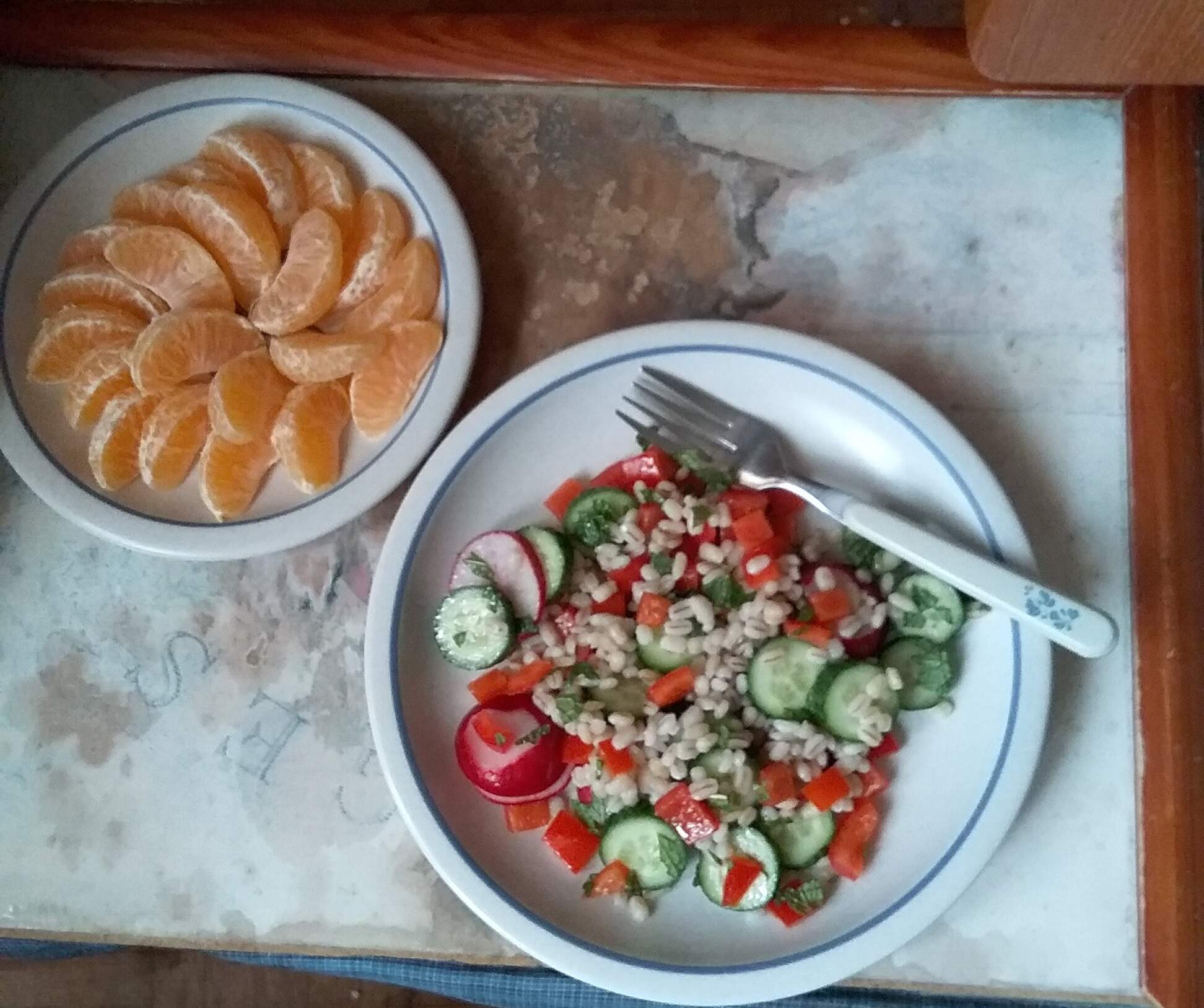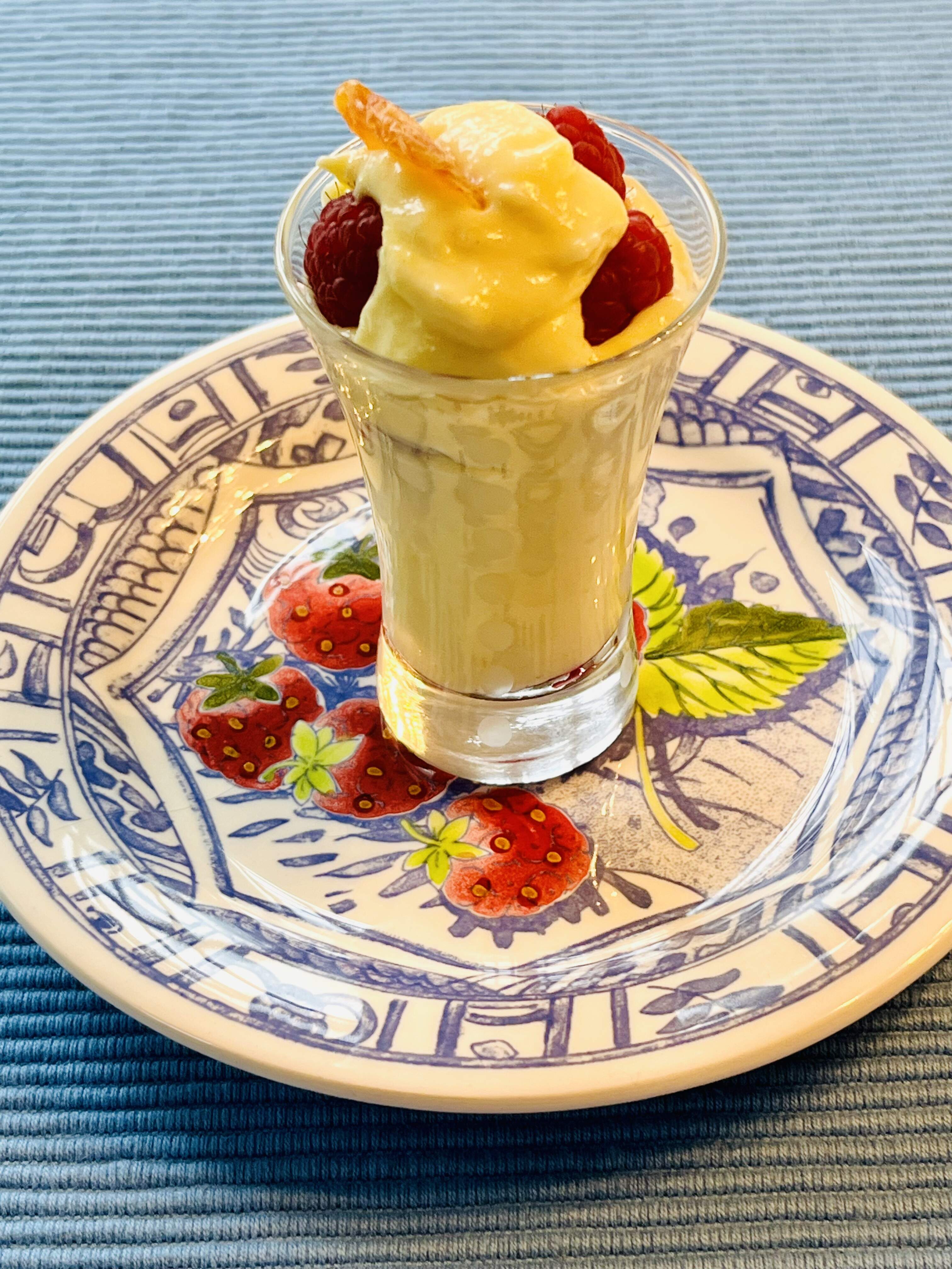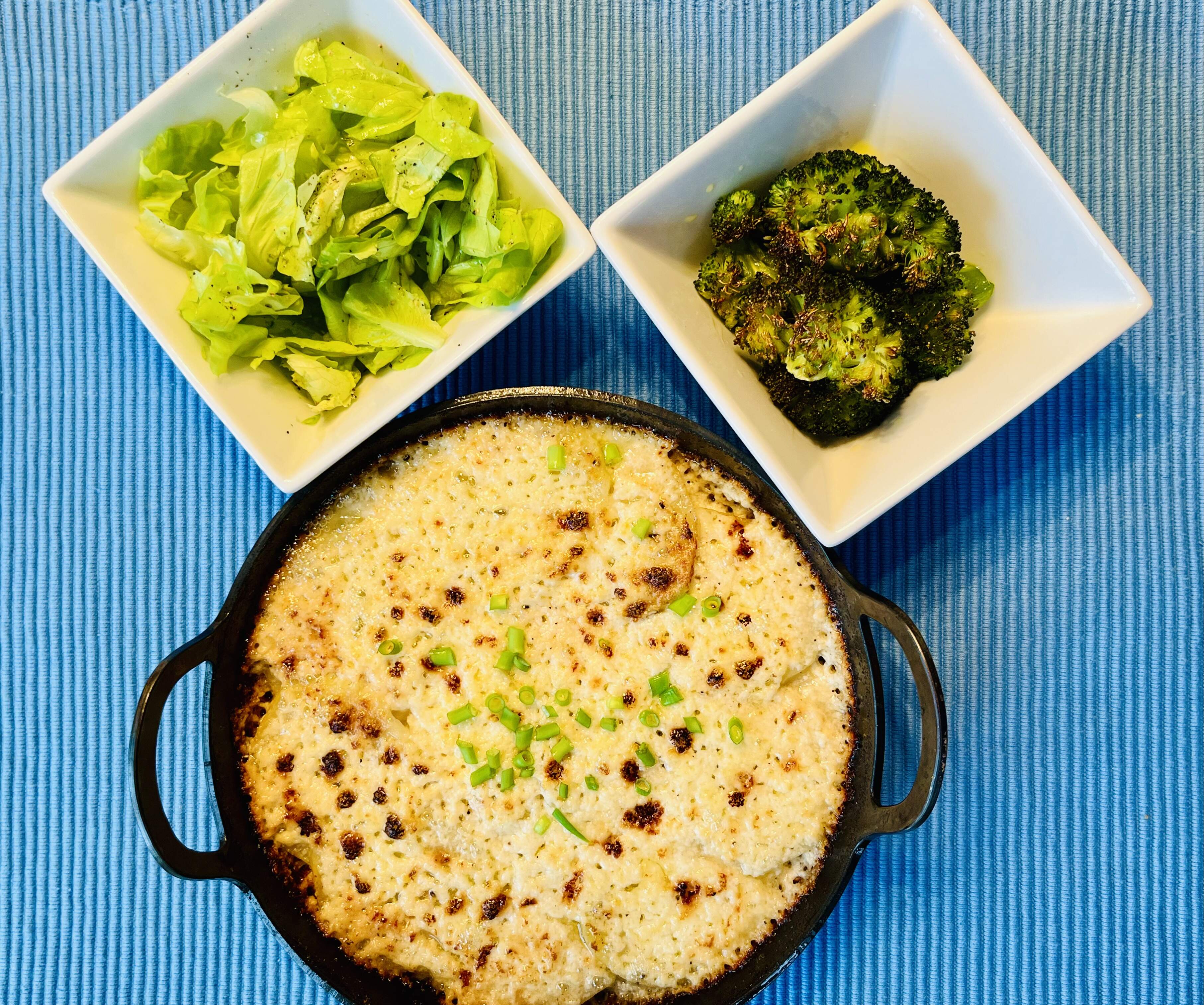 I was in the mood for potato au gratin, so one russet potato, bechamel and some unexpected cheddar from TJ, and ecco! Happy Camper! Some oven roasted broccoli and a green salad vinaigrette, followed by raspberries and orange pastry cream whipped up with a little sour cream.