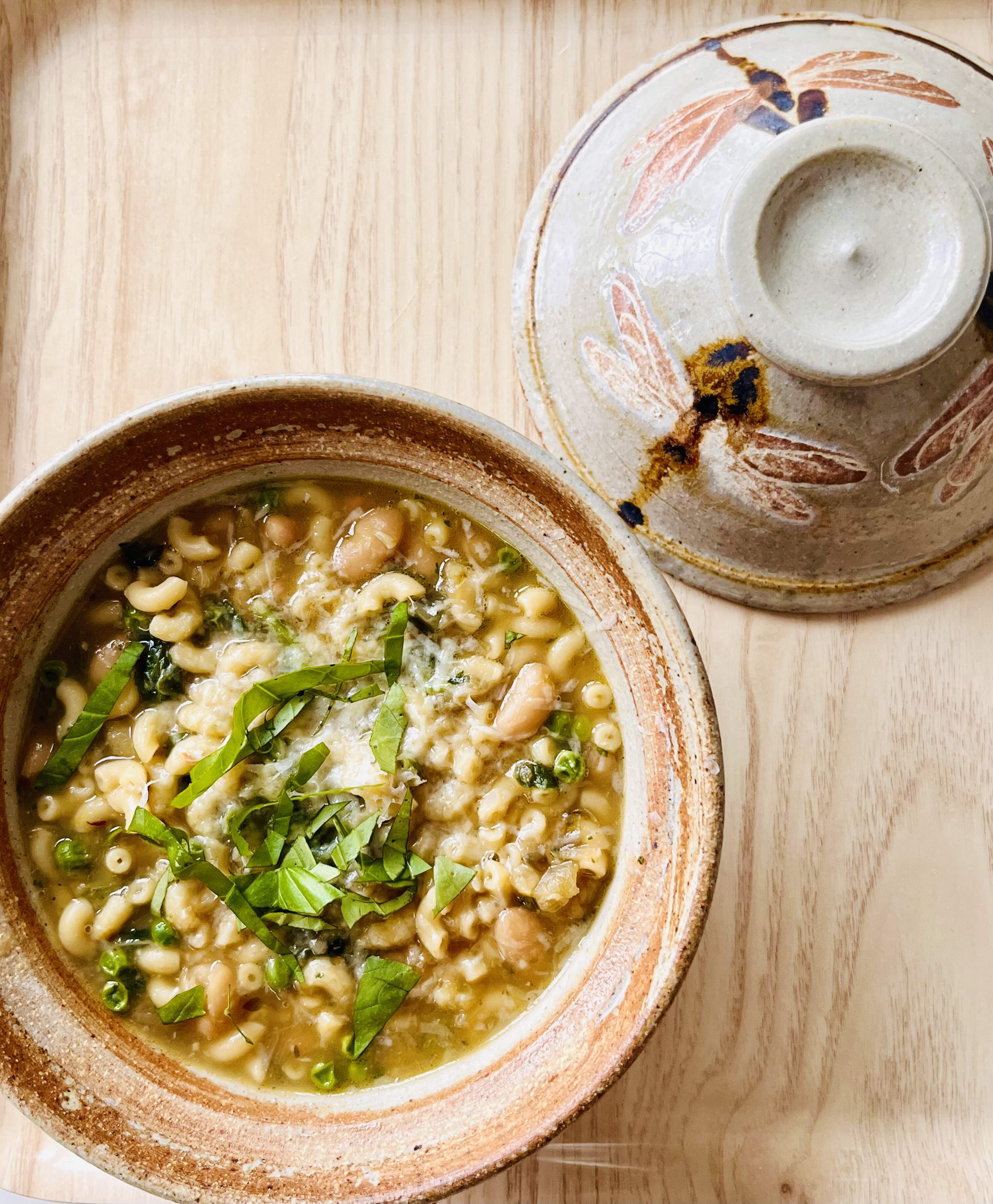 Soup, glorious soup! So nice on a snowy day, bean, peas, spinach, elbows, Parmesan and basil.
