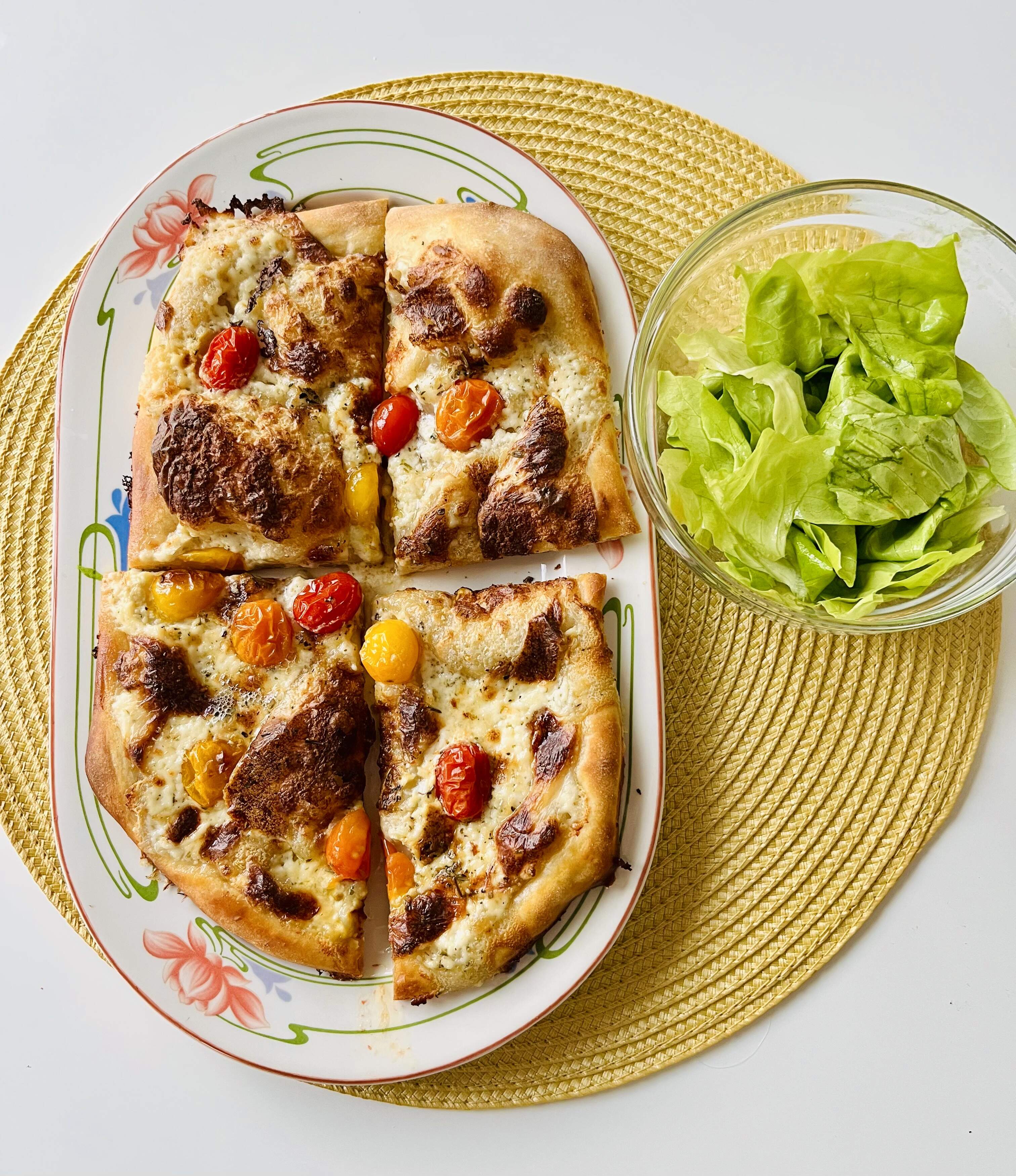 Pizza with ricotta and a little Camembert cheese, sprinkle tomatoes, herbs de Provence.