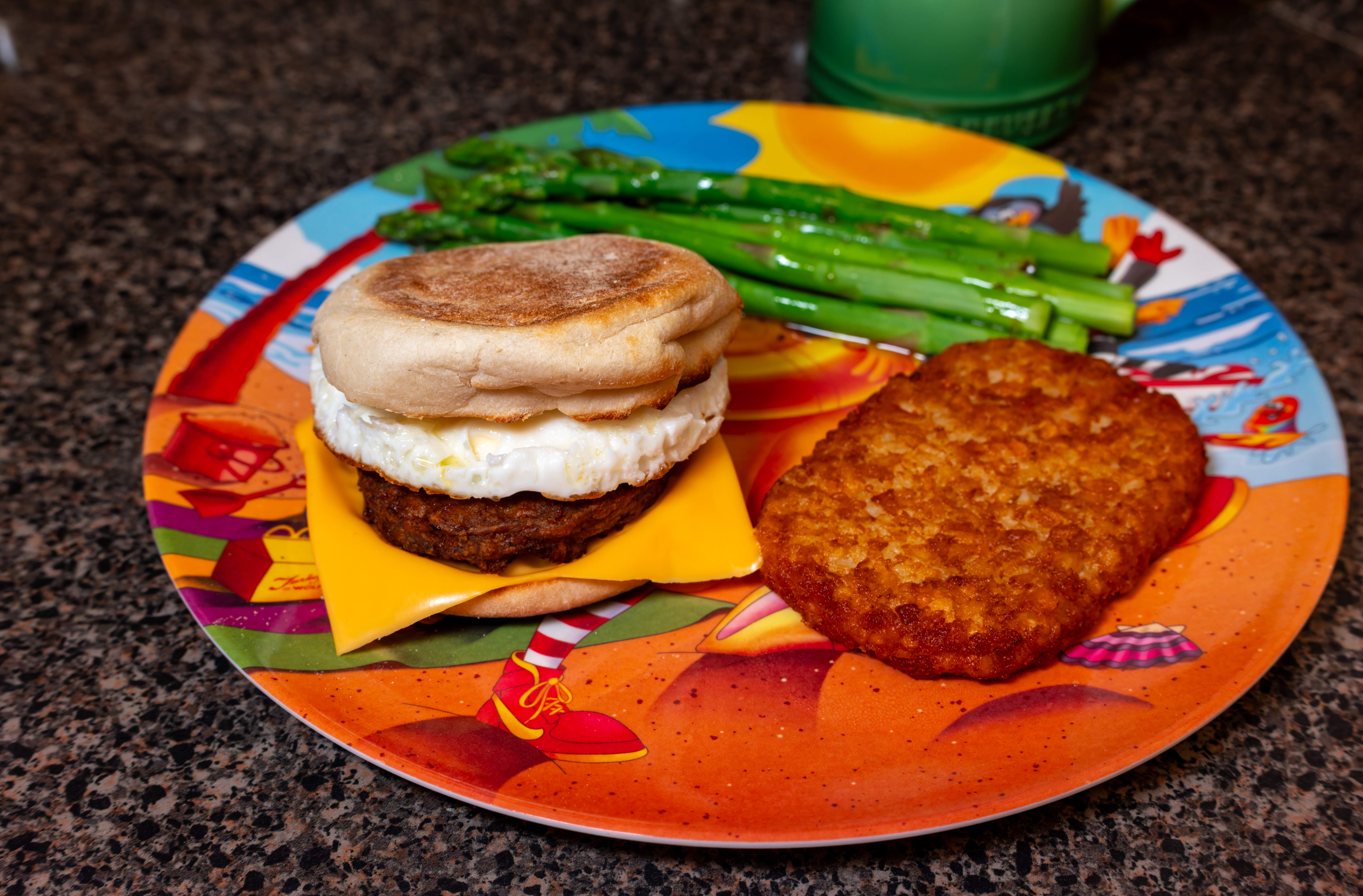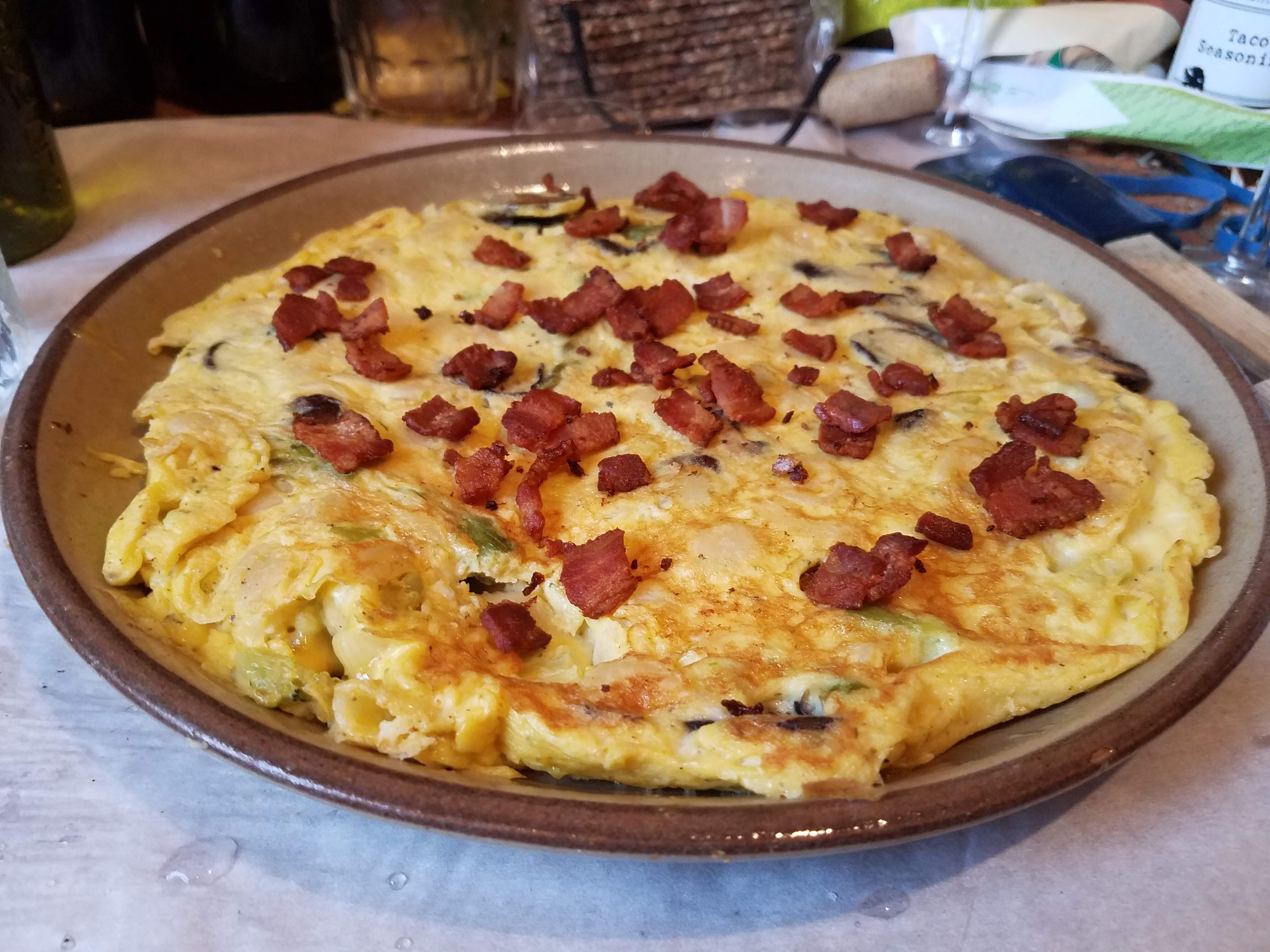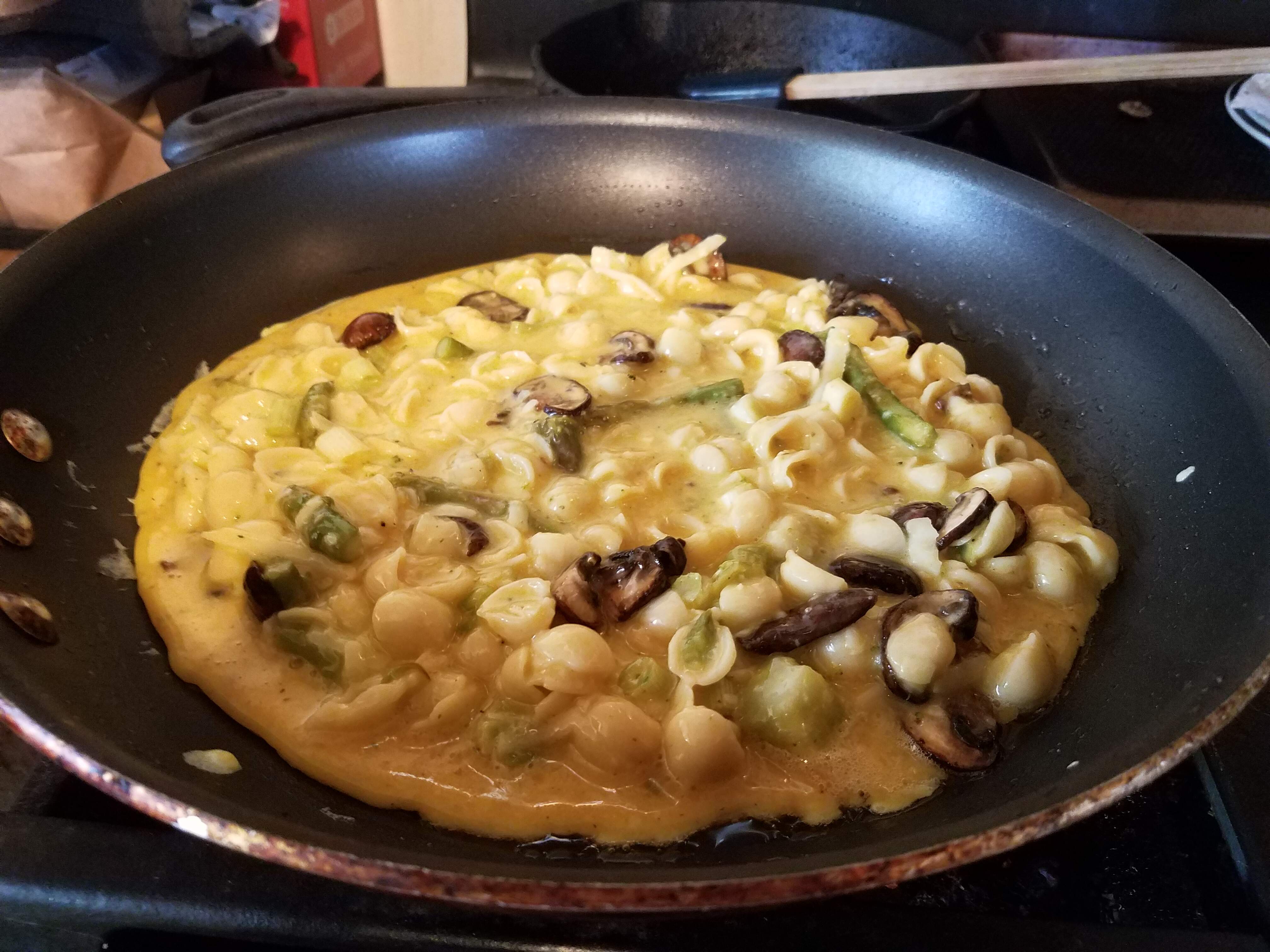 So, diced bacon fried and put aside for topping. Sliced mushrooms sauteed. Four eggs and about the same volume of the leftover pasta which already had asparagus and broccoli bits, diced green onion, mushrooms mixed in, lots of shredded kaseri and romano cheese. In the pan cooking:
