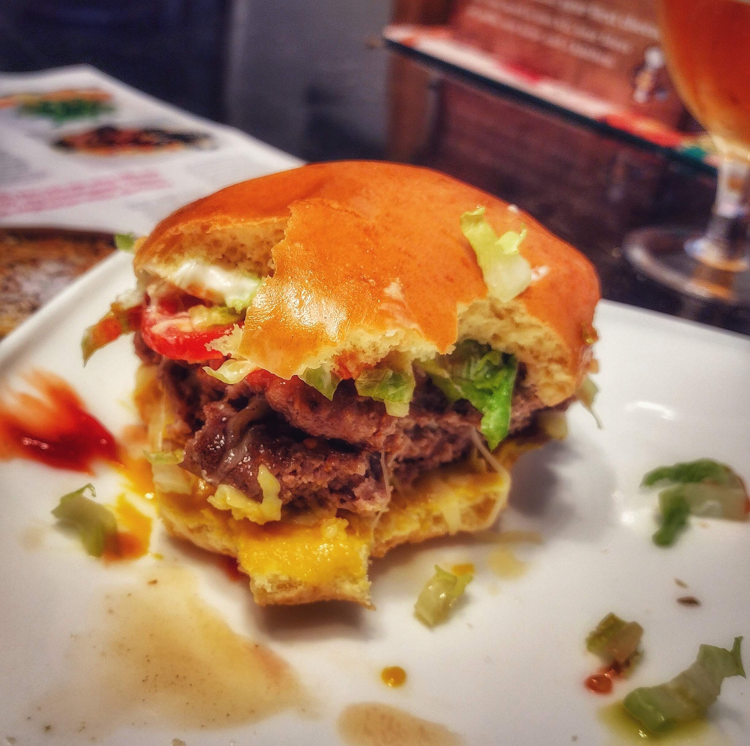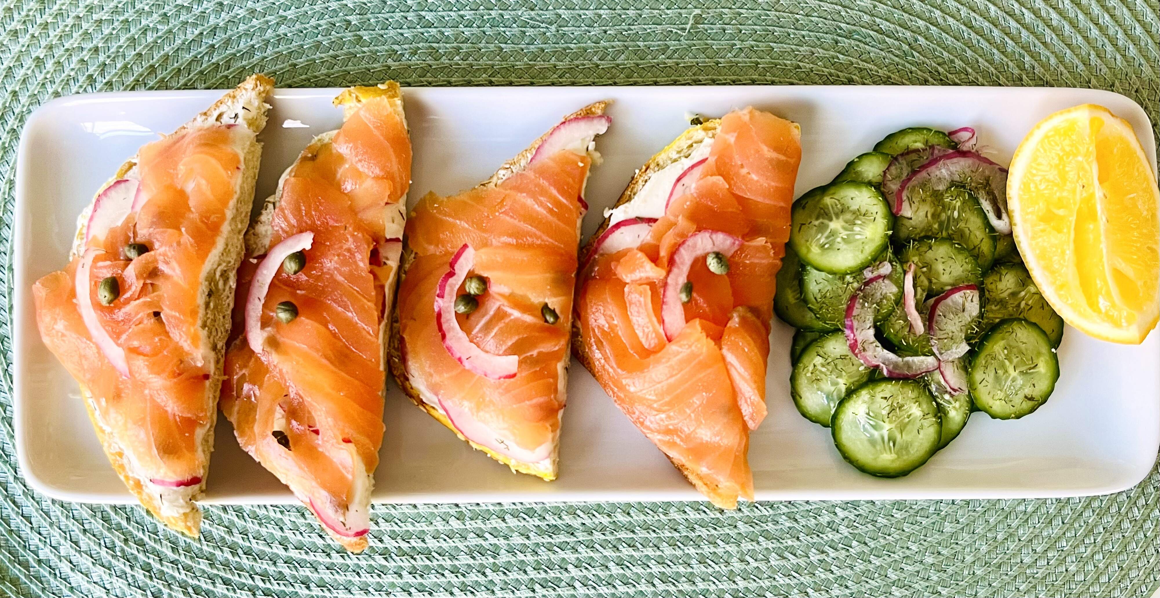 Salmon on thinly sliced olive rosemary semolina bread, a layer of cream cheese, lightly pickled red onions and capers. I enjoy the triangles with the cuc slices layered across the top.