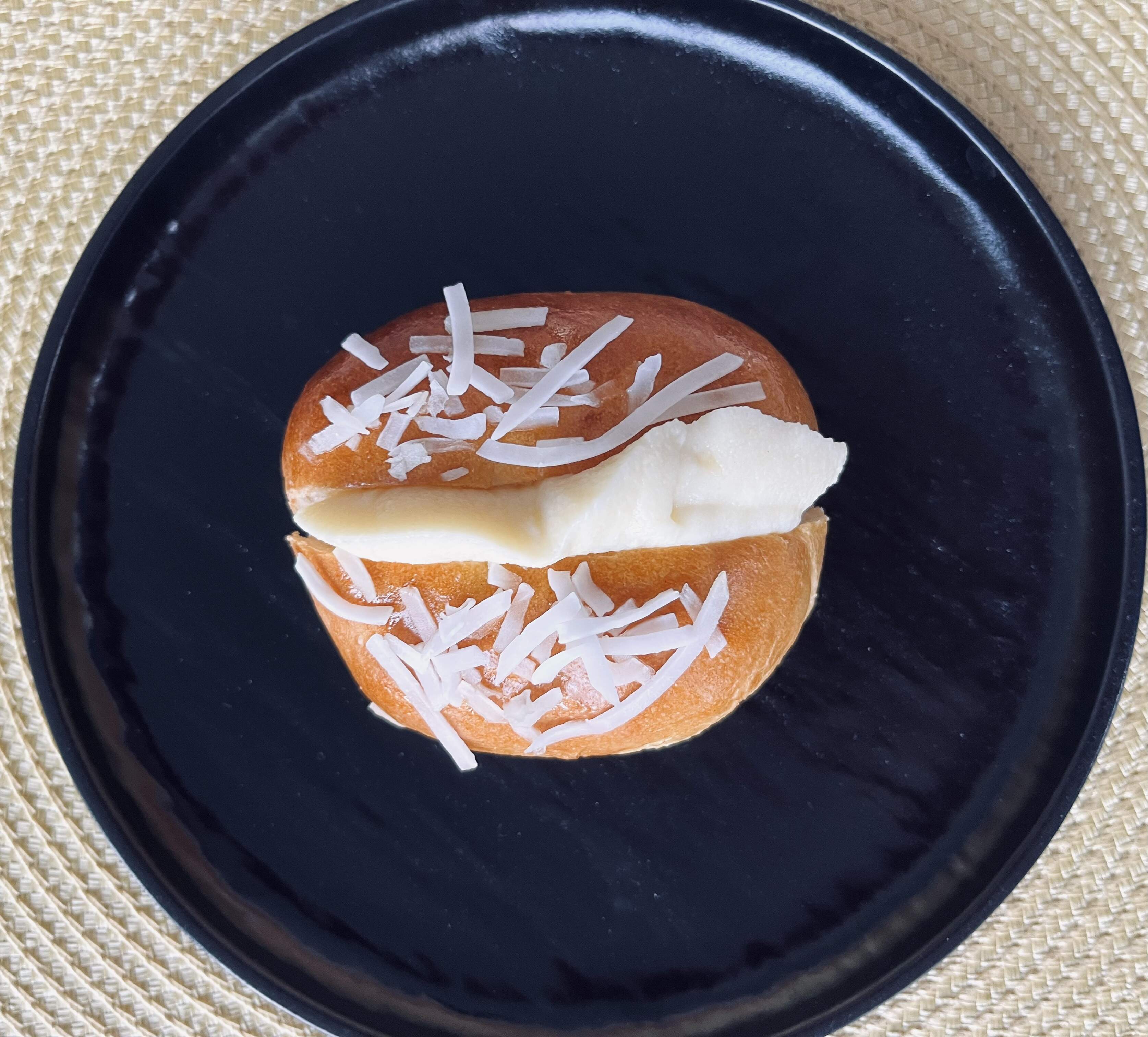Coconut bun with crème patisserie.