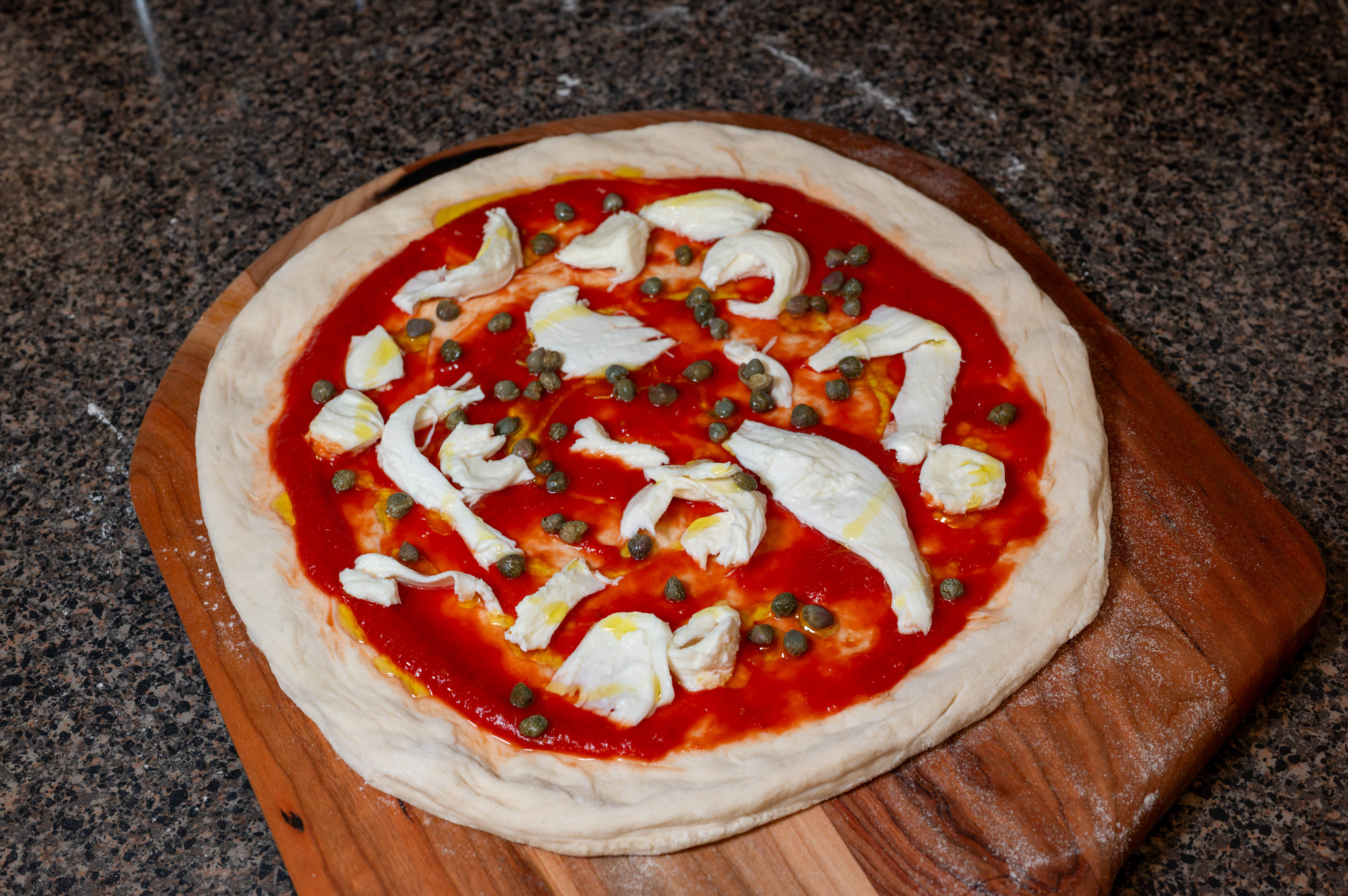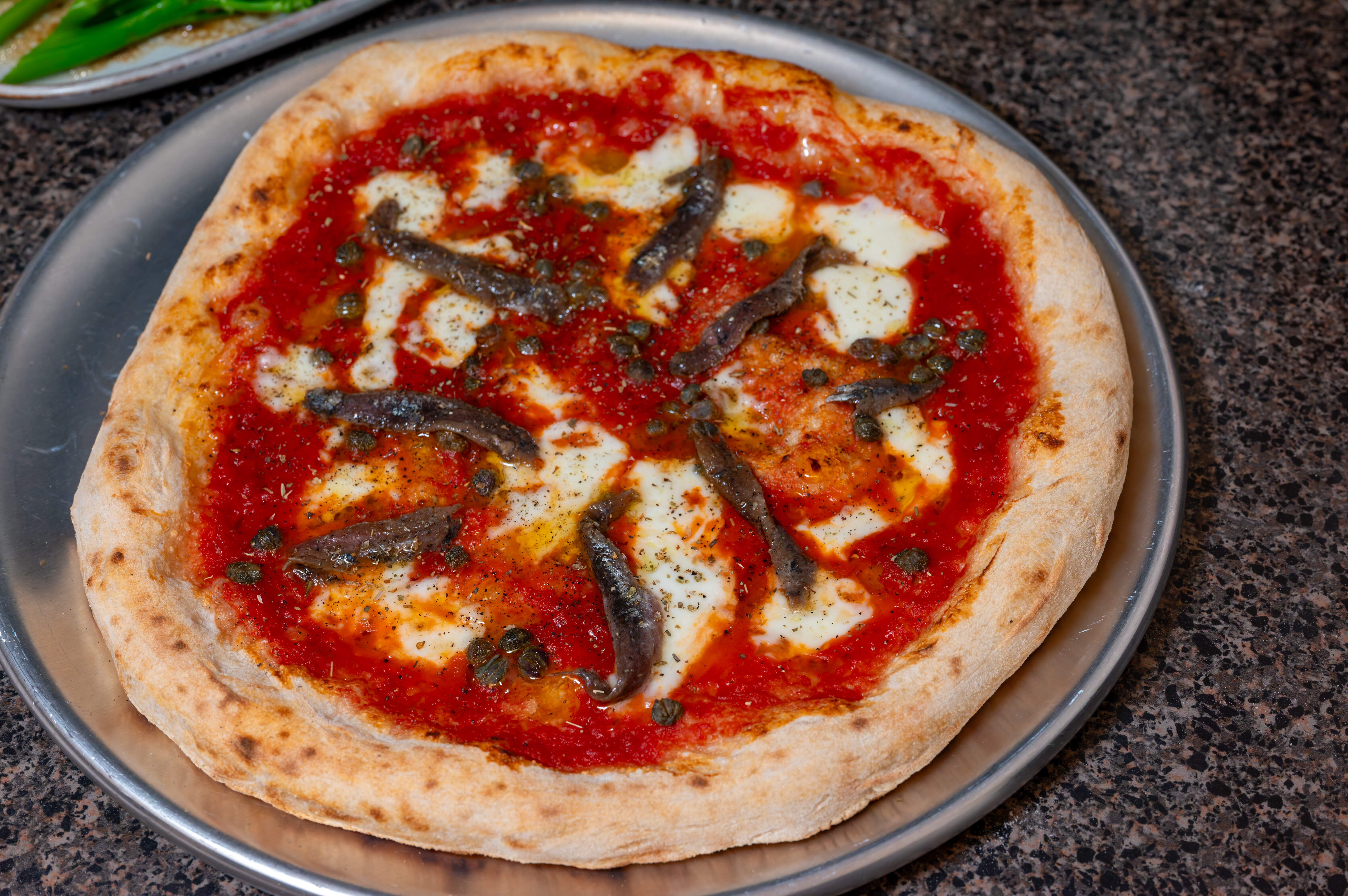 Neapolitan style pizza with fresh mozzarella, capers, anchovies, and oregano