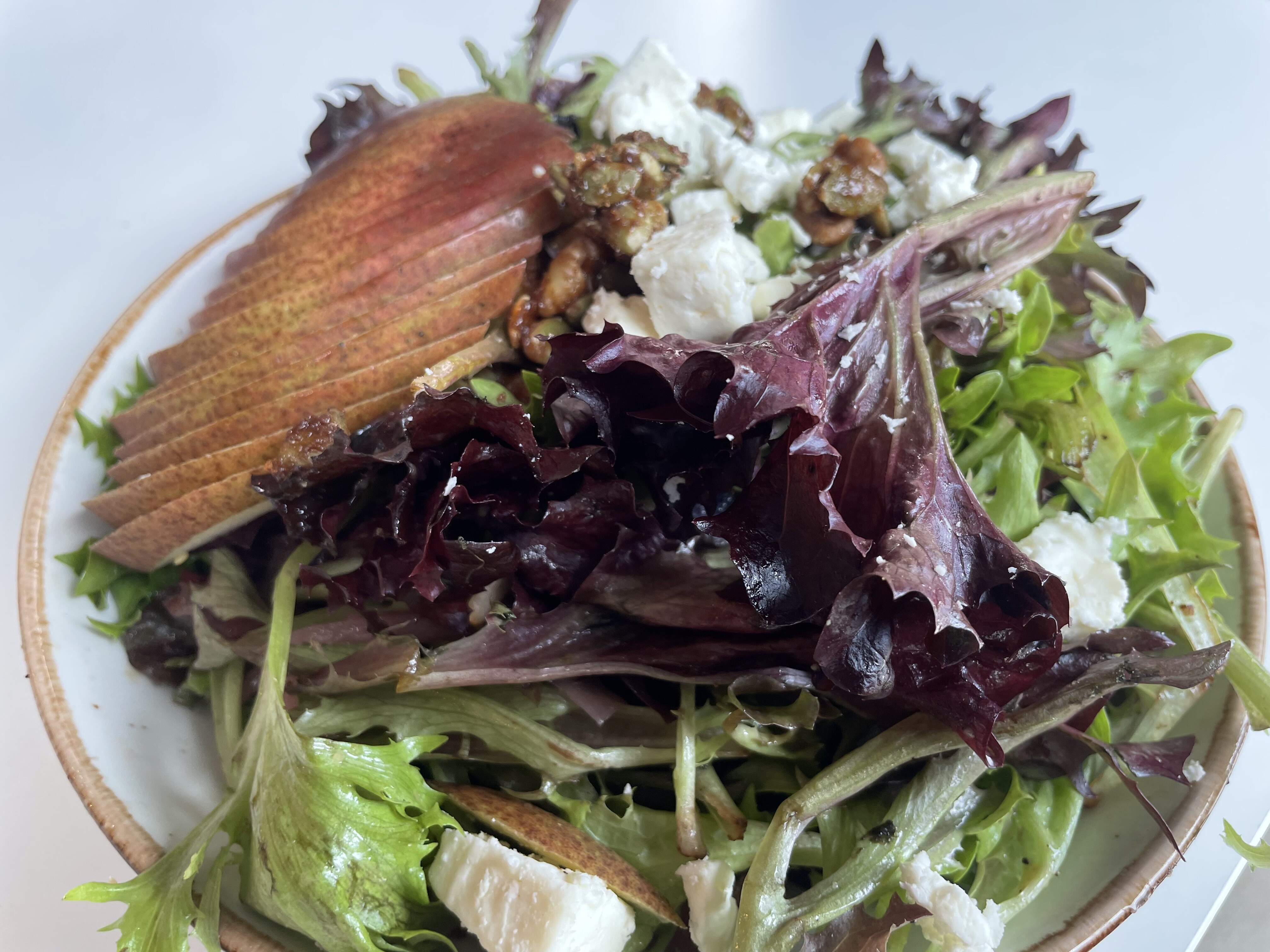 The Salad - Hearty greens, pear maple dijon dressing, red grape, pickled red pepper onion, roasted purple potato, walnut pumpkin brittle, feta