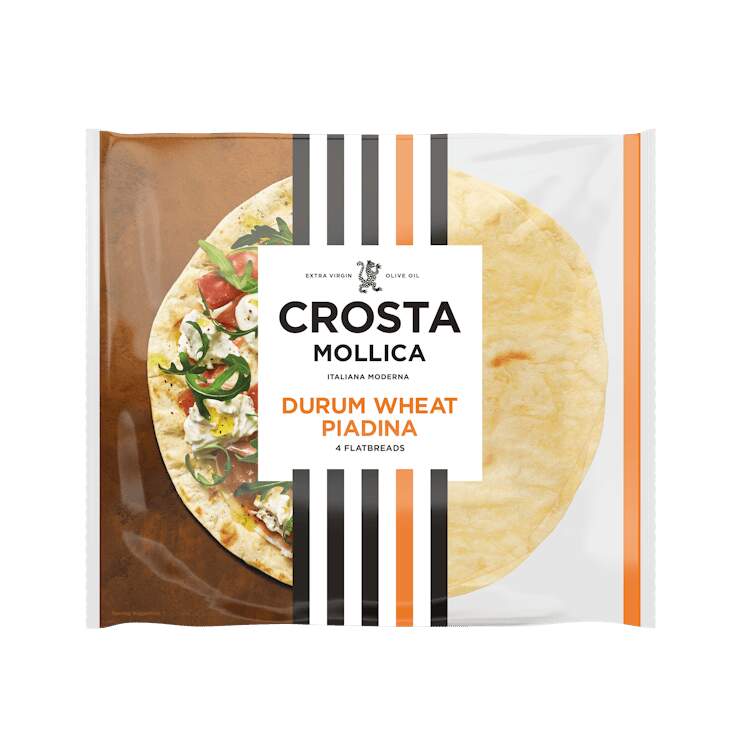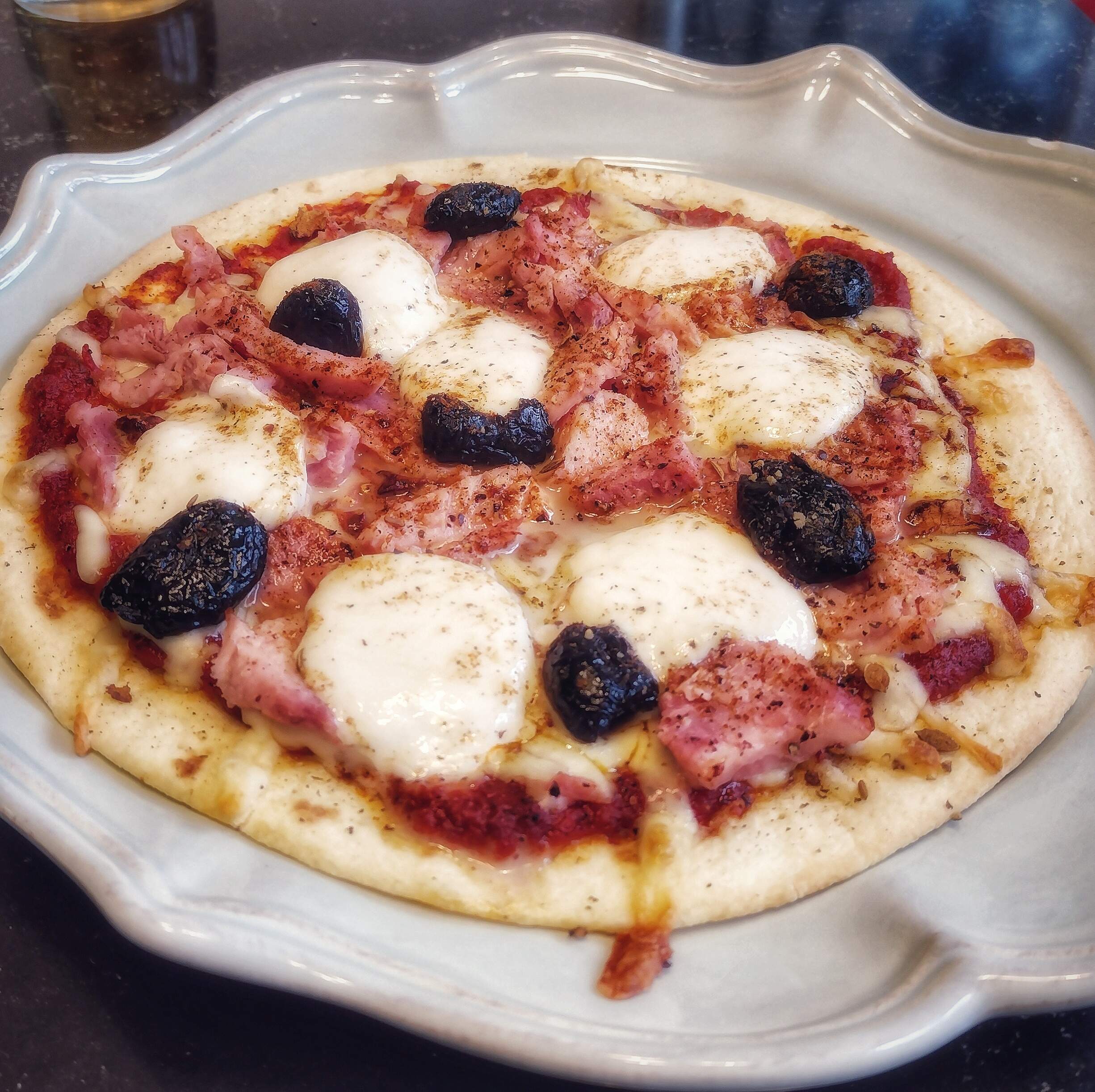 Ham, mozzarella, black olive ‘pizza’ on durum flatbread…