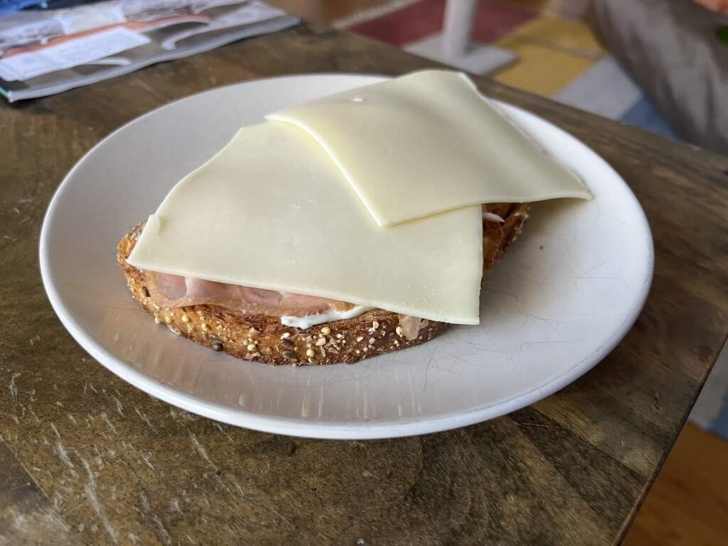 A quick sammich late in the day: Aldi’s seeded bistro bread, shmear, celebration ham, havarti.