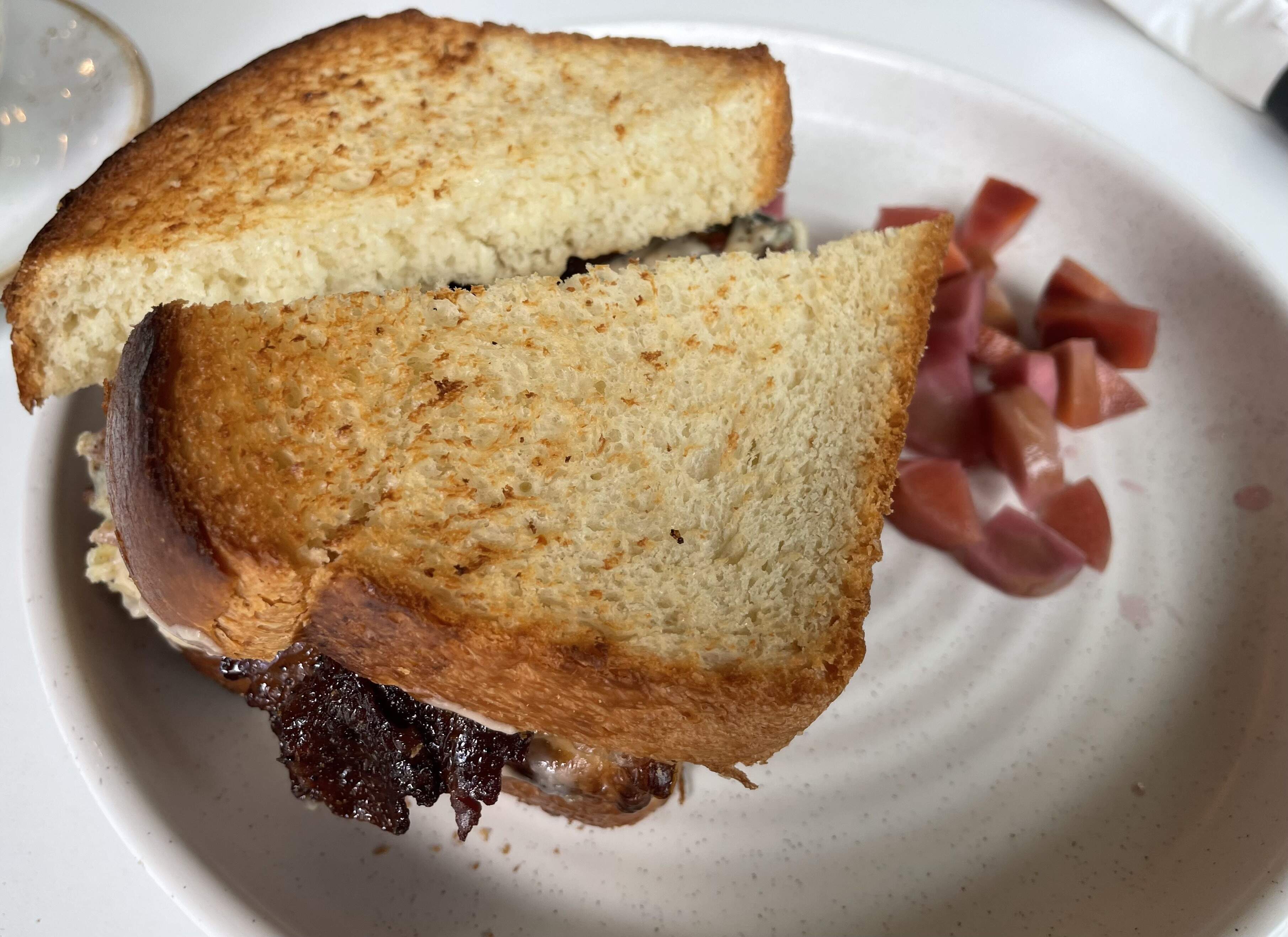 Frittata Sandwich - Whole egg frittata with roasted sweet potato, caramelized onion, kale, swiss, bechamel, bacon, toasted japanese milk bread
