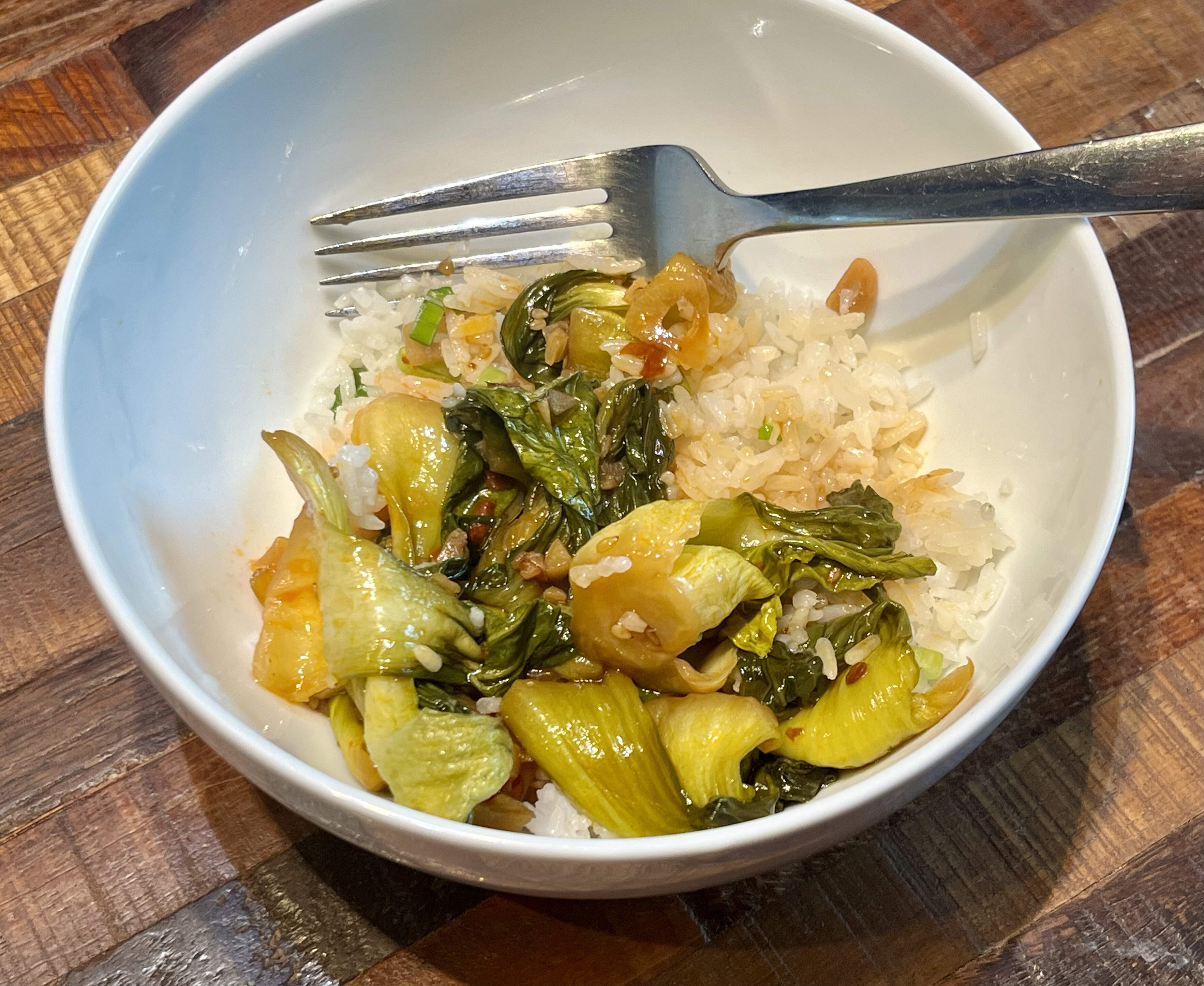 Quick lunch in between driving doodies: garlic rice with the last of the baby bok choy from last night.