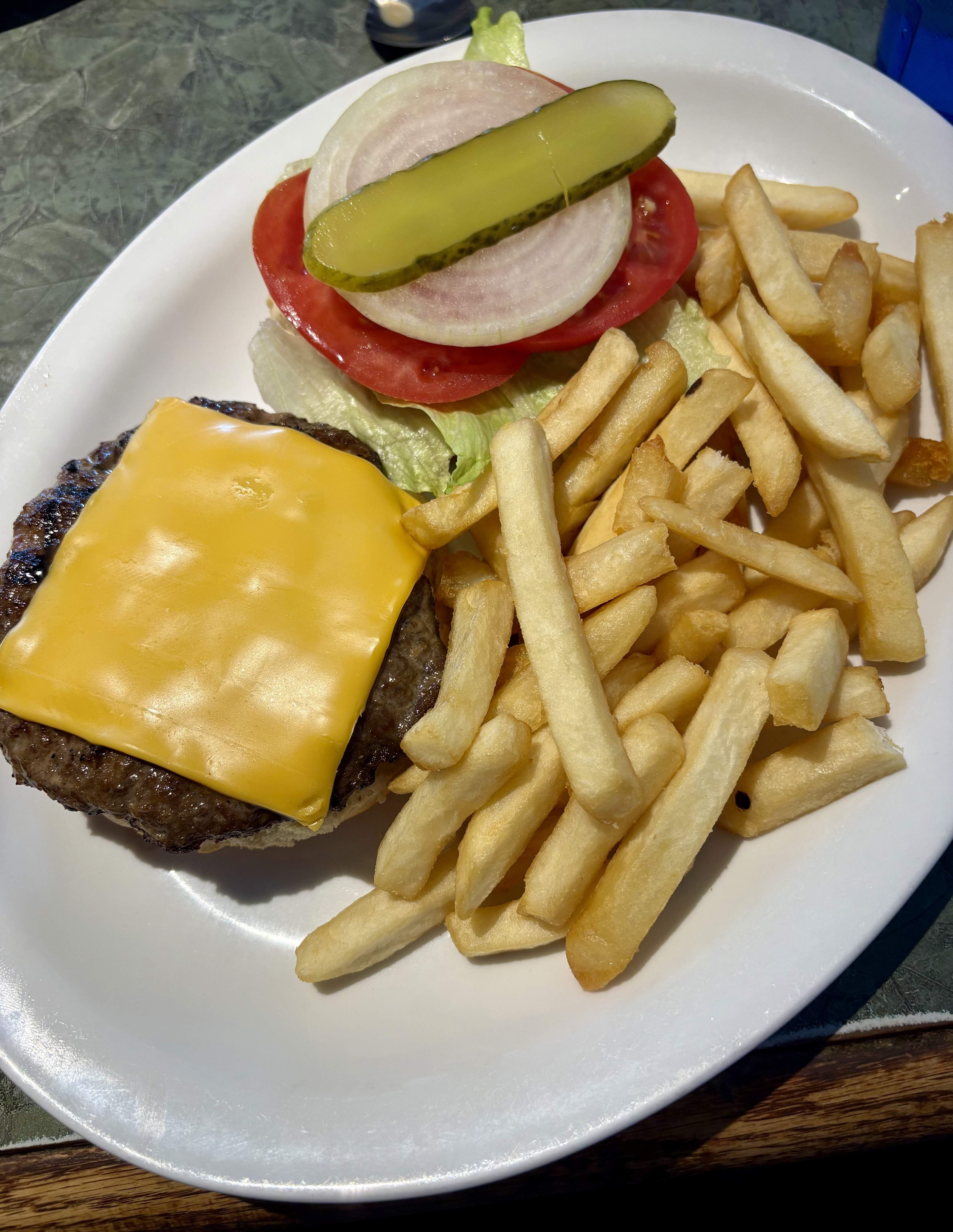 I had the homemade cheese burger and fries(my sister gifted me a strip of crispy bacon to add on top, but I had already taken a bite out of it. A squirt of catsup was also added to the burger , and there as also mayo and catsup for the fries.
