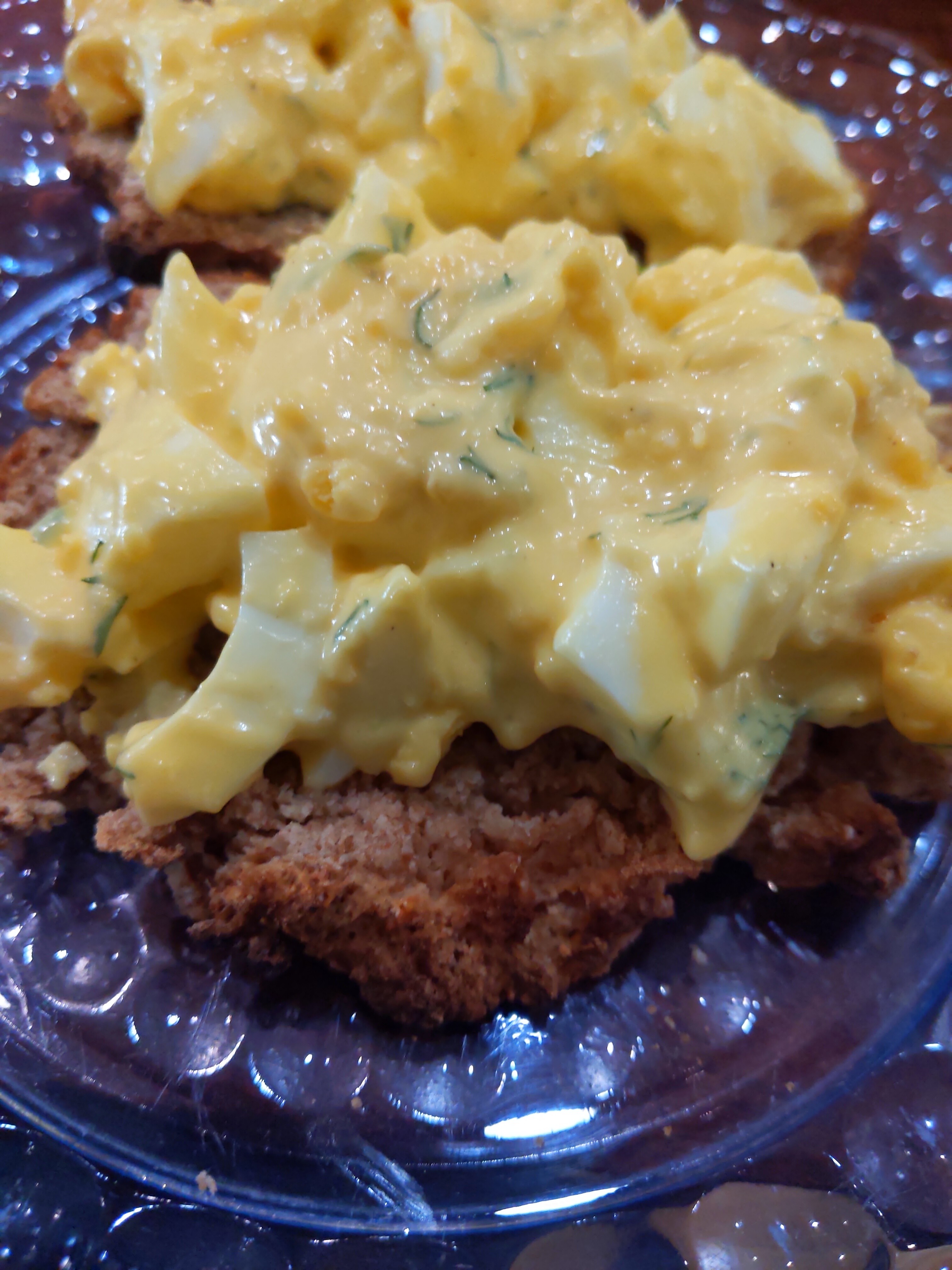 I love baking during voice calls, the best part of remote work! This morning I made some quick brown bread with wheat bran and wheat germ, and then made some egg salad to have on top. Egg salad was 4 eggs plus 2 egg yolks (for 2 people) plus homemade mayo and some dill I had leftover.