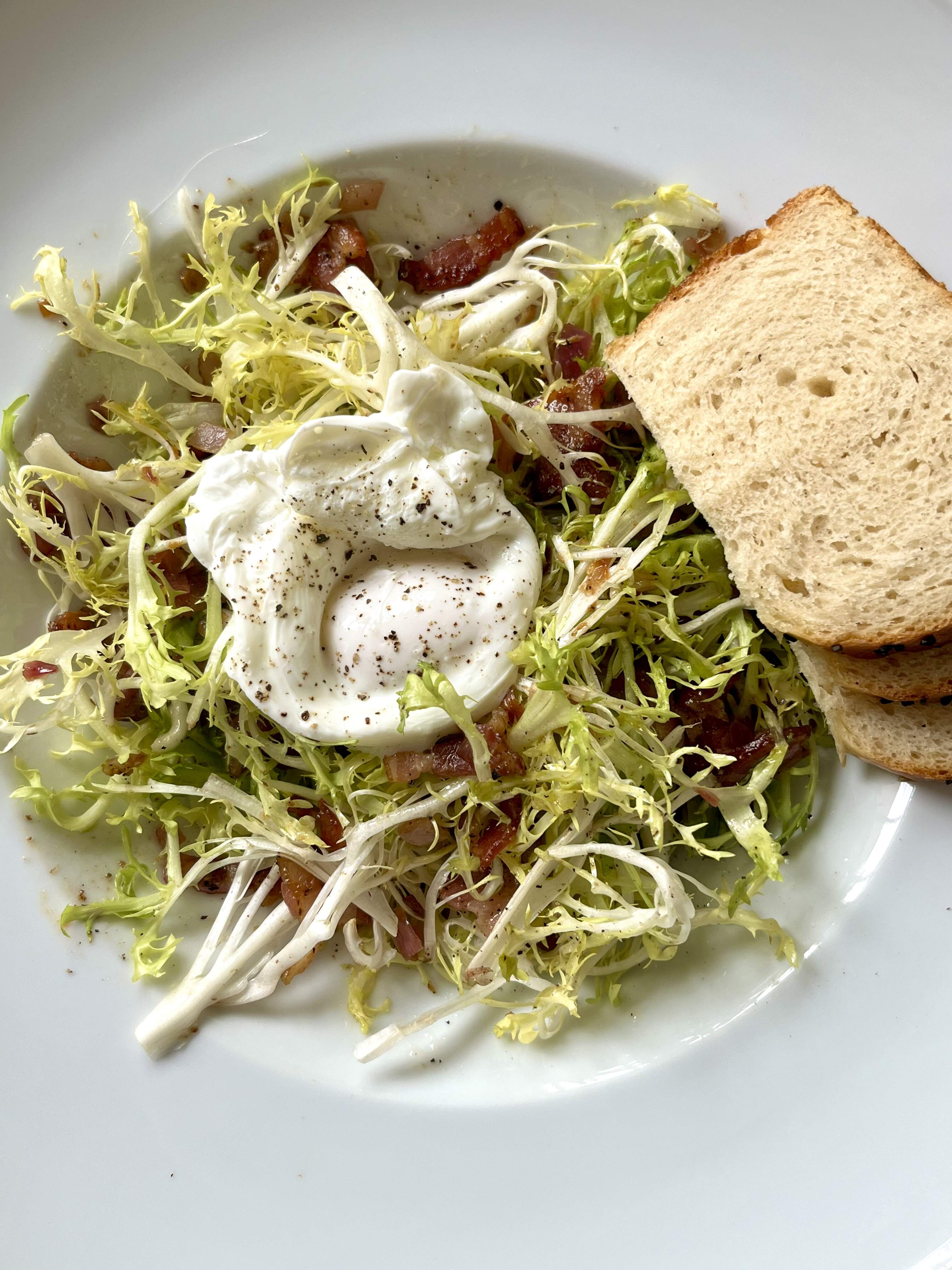 Salade Lyonnaise, so darn good. Inadvertently cut up three slices of bacon into lardons, a pity! Onion rye bread on the side to help out with the salad dressing.
