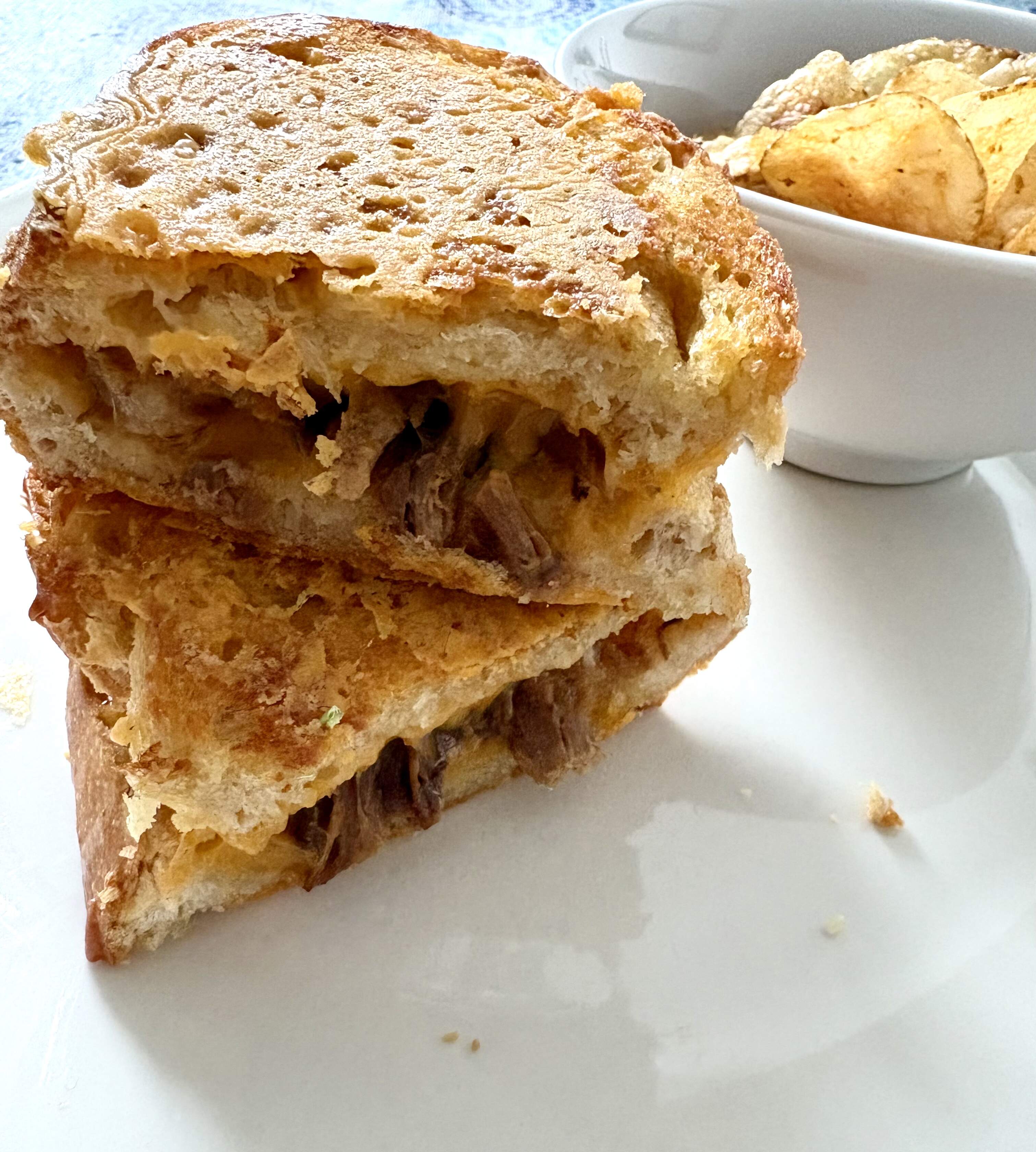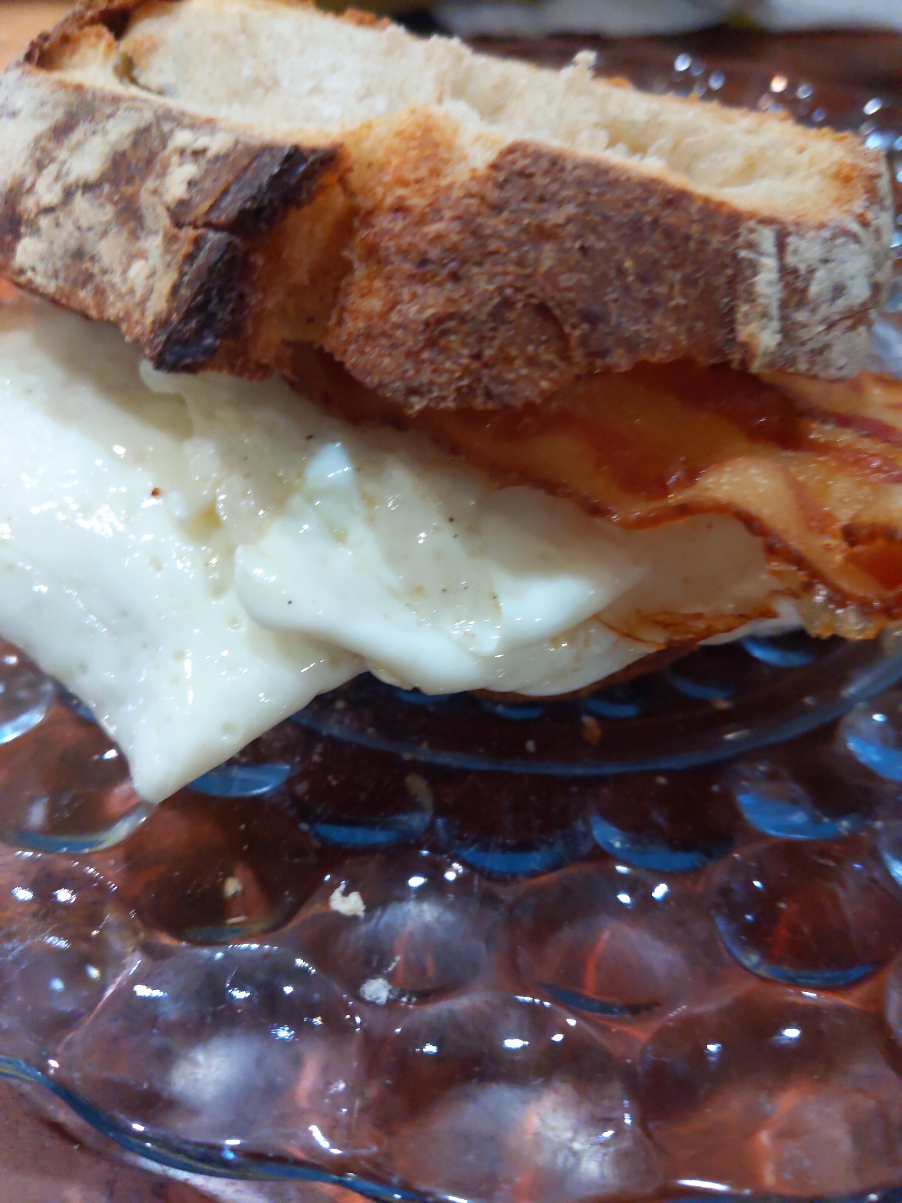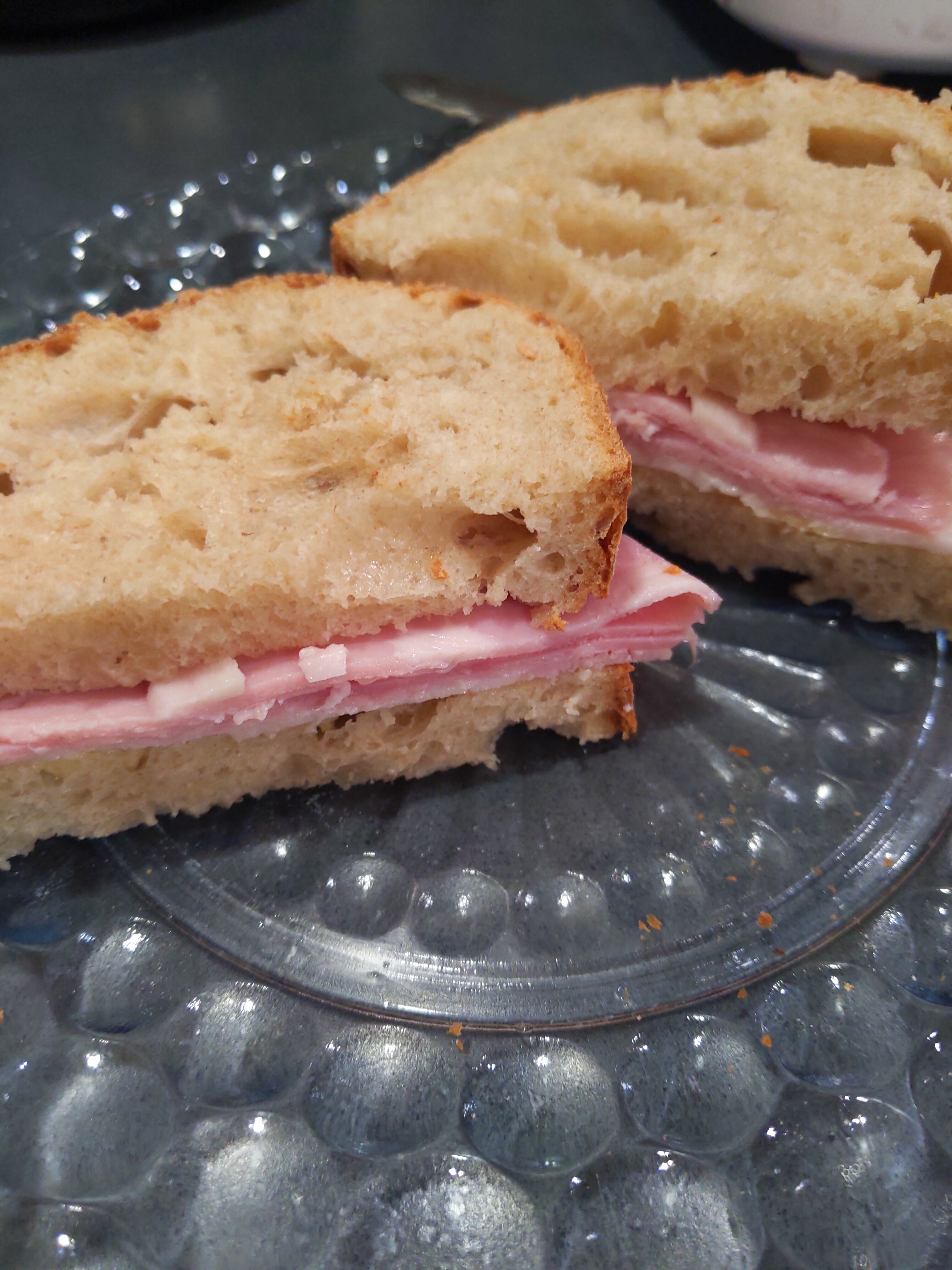 Toasted ham and cheese: two slices of sourdough, one spread with Roland Dijon and one with Duke’s mayonnaise, smoked Black Forest ham, provolone stagianato, and sliced Campari tomato. Basic but delicious.