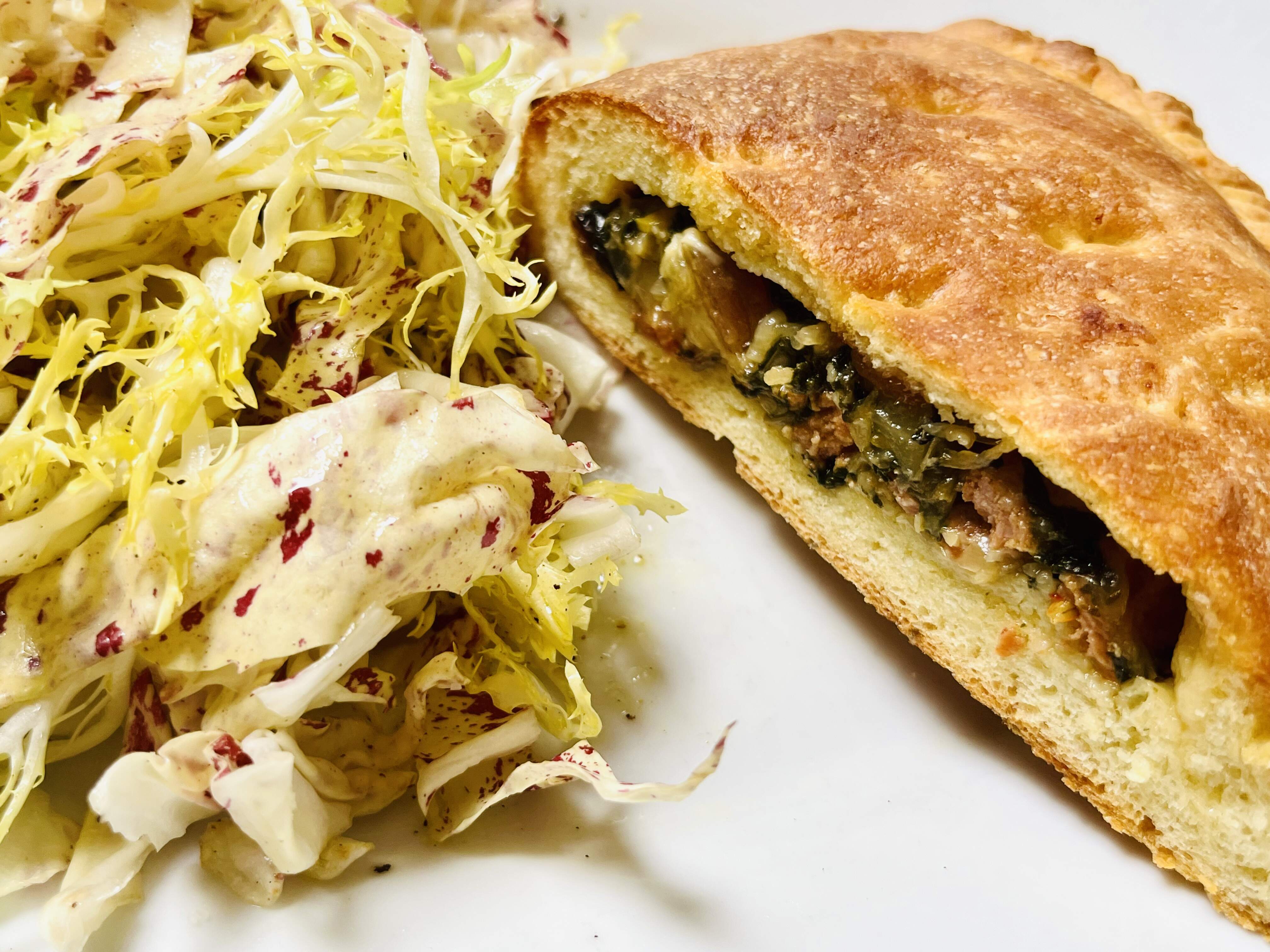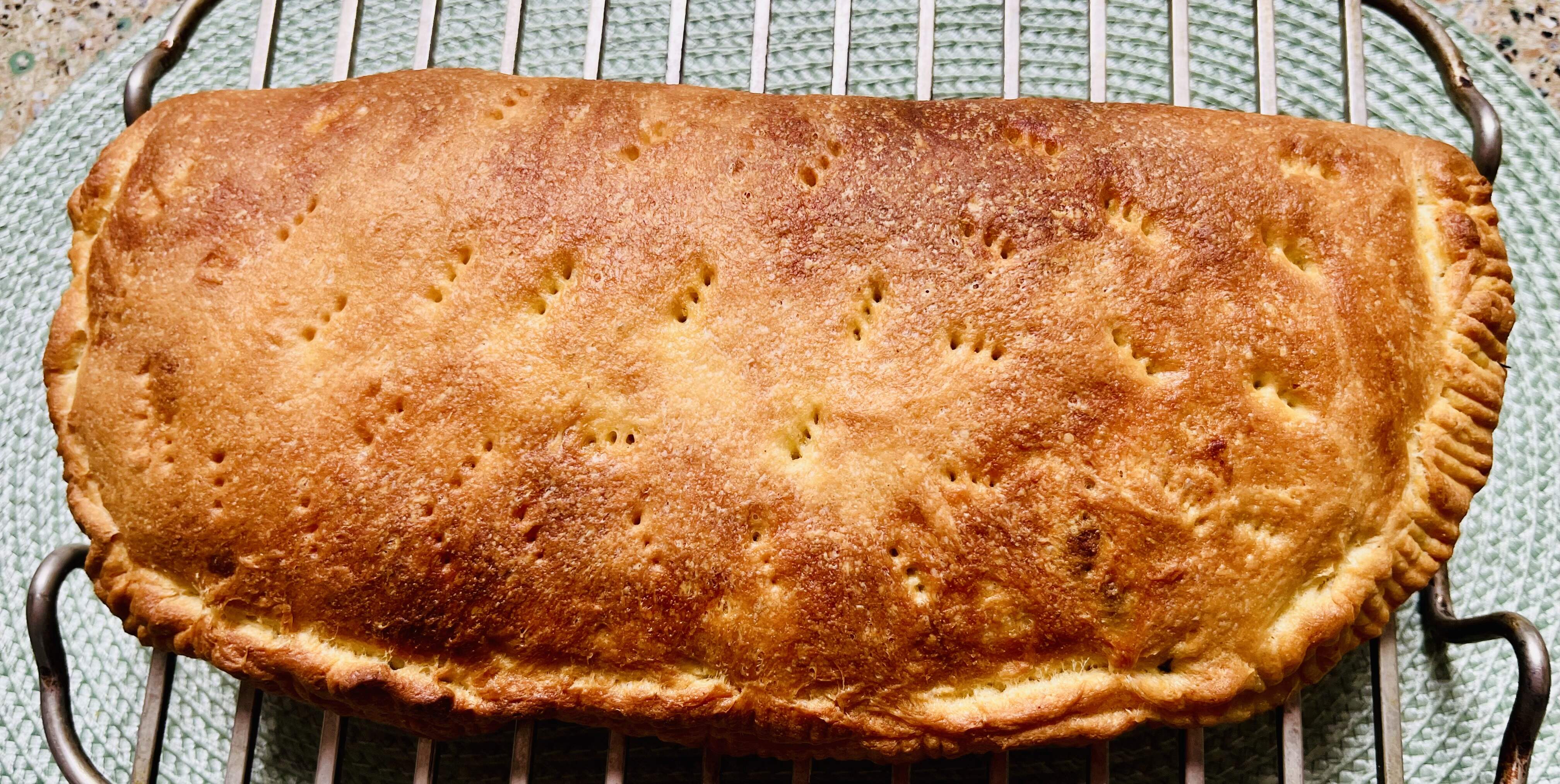 An onion pie of sorts, called cudderuni, a Sicilian semolina bread. This was filled with sautéed onions, Swiss chard, hot pepper sausage, black olives , mozzarella cubes and tomato jam. It’s absolutely delicious, and I look forward to the remaining part. This lends itself to multiple vegetable combinations, sautéed savoy cabbage would be a plus!