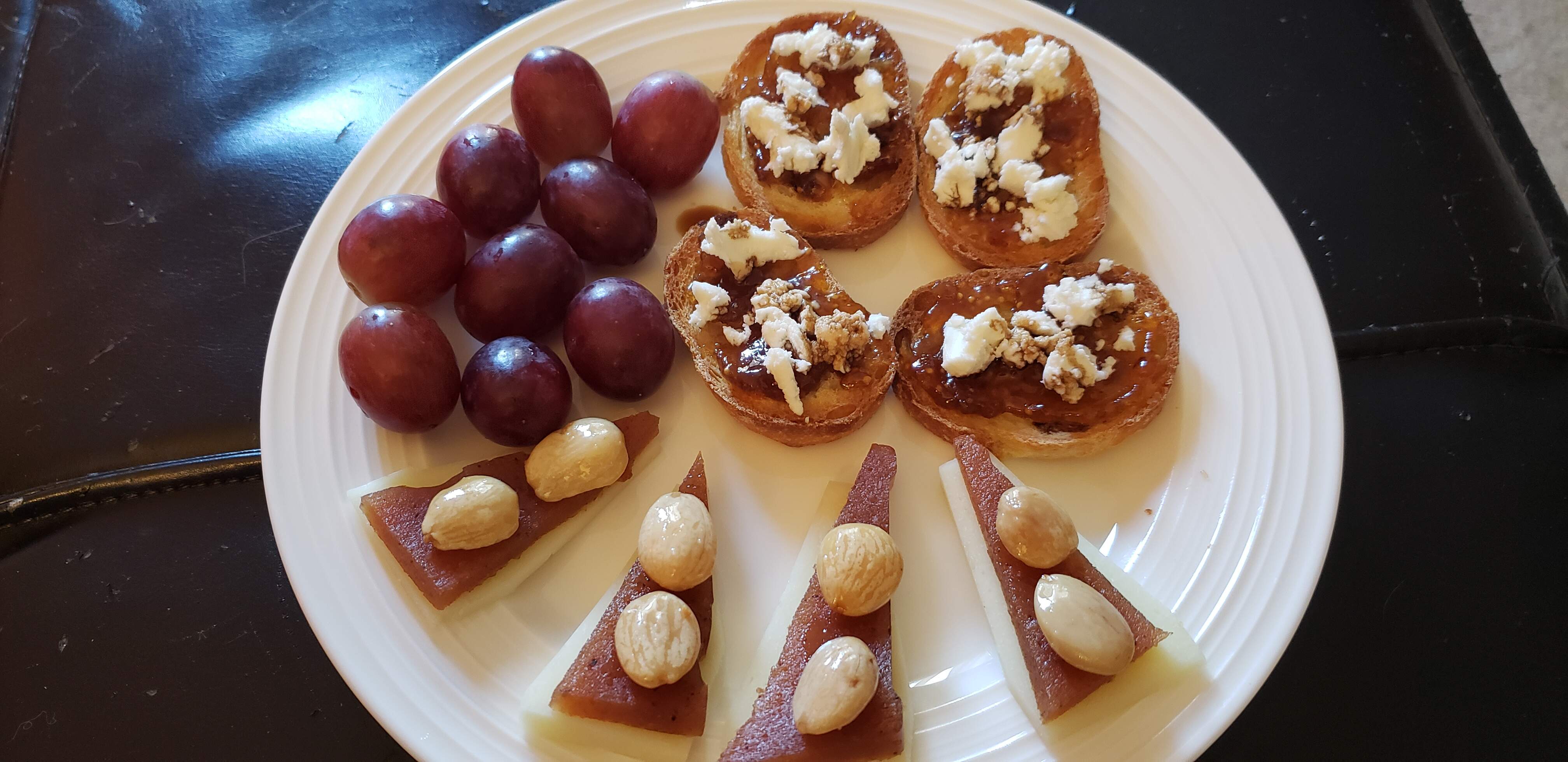 Manchego, quince paste, and Marcona almonds, toasted baguette slices with fig jam, goat cheese, and a balsamic drizzle, and red grapes. Tided me over quite nicely.