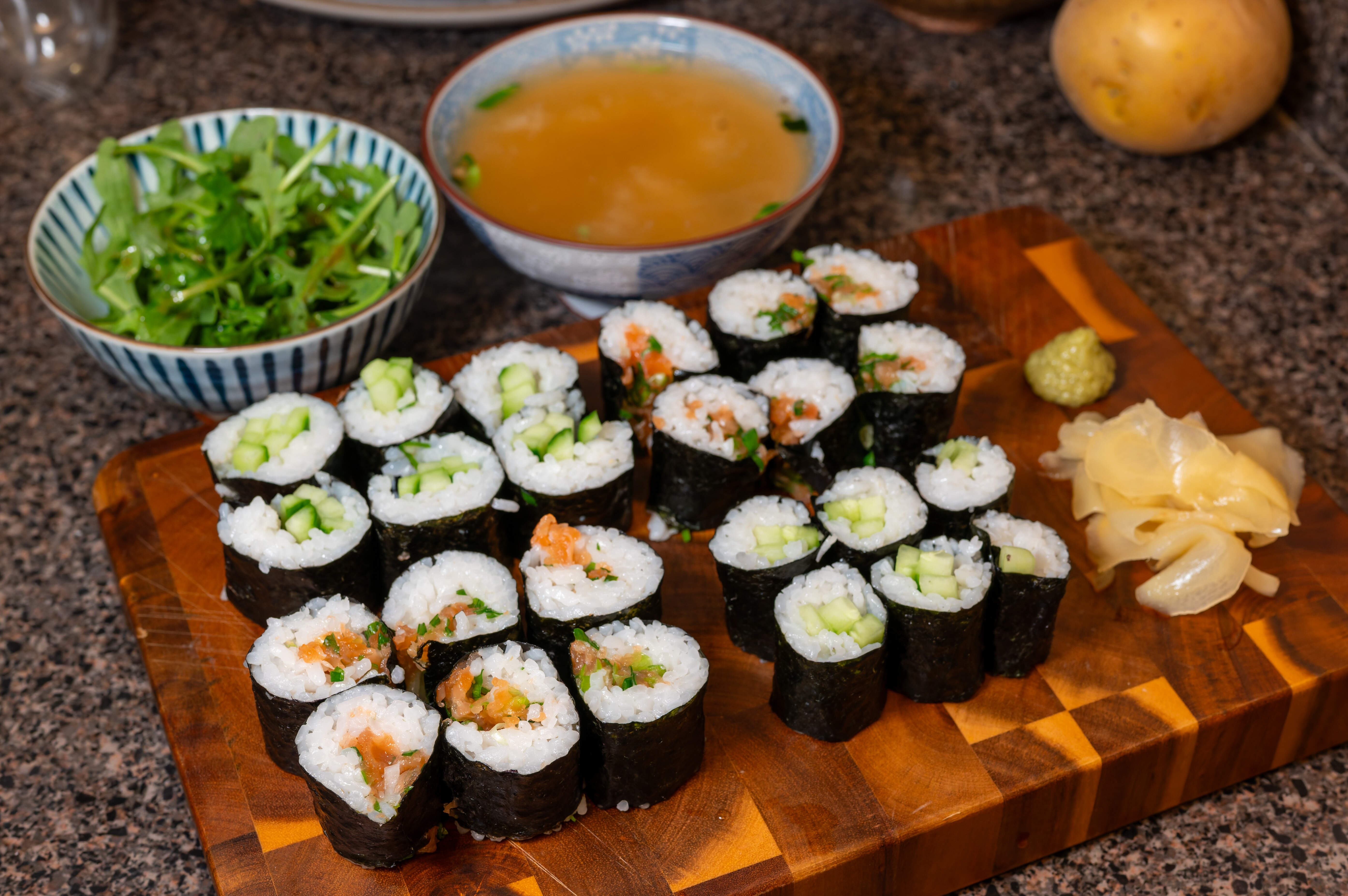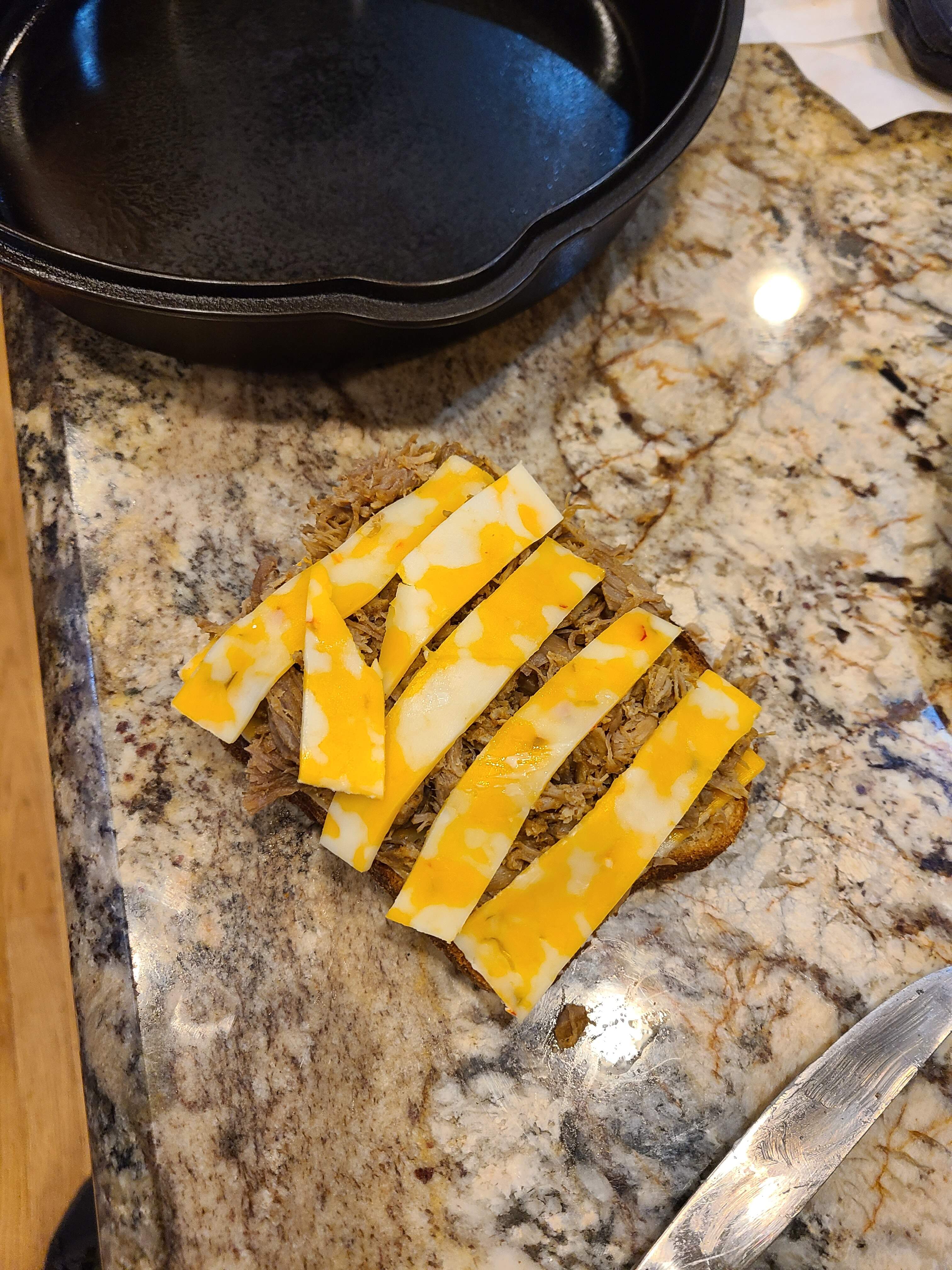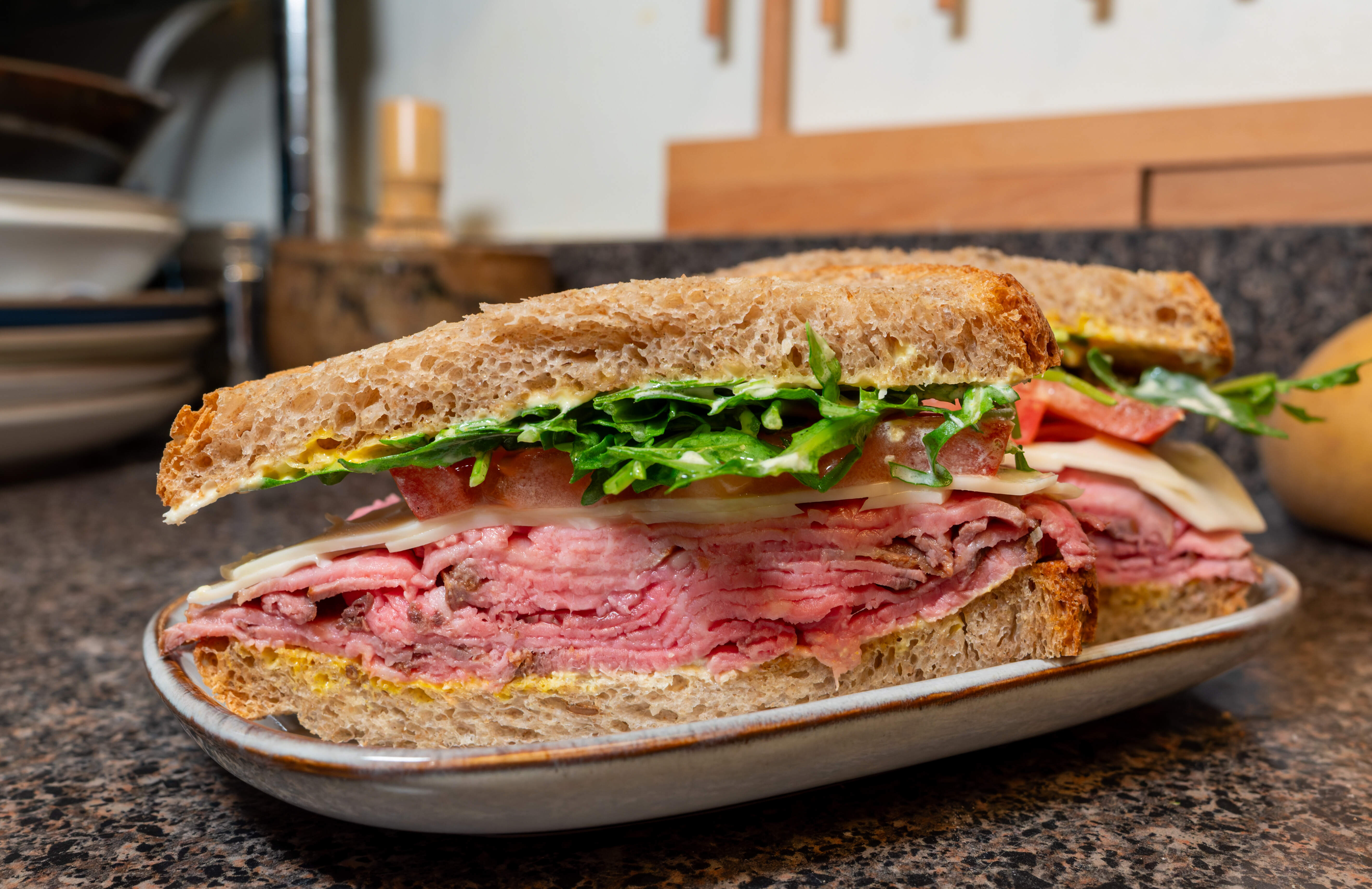 Roast beef and Swiss on rye. There was eye of round roast on sale, and I made some roast beef with it - seared in pan, roasted in low 225 degree oven until 130F, cooled in fridge, and sliced against the grain with meat slicer.