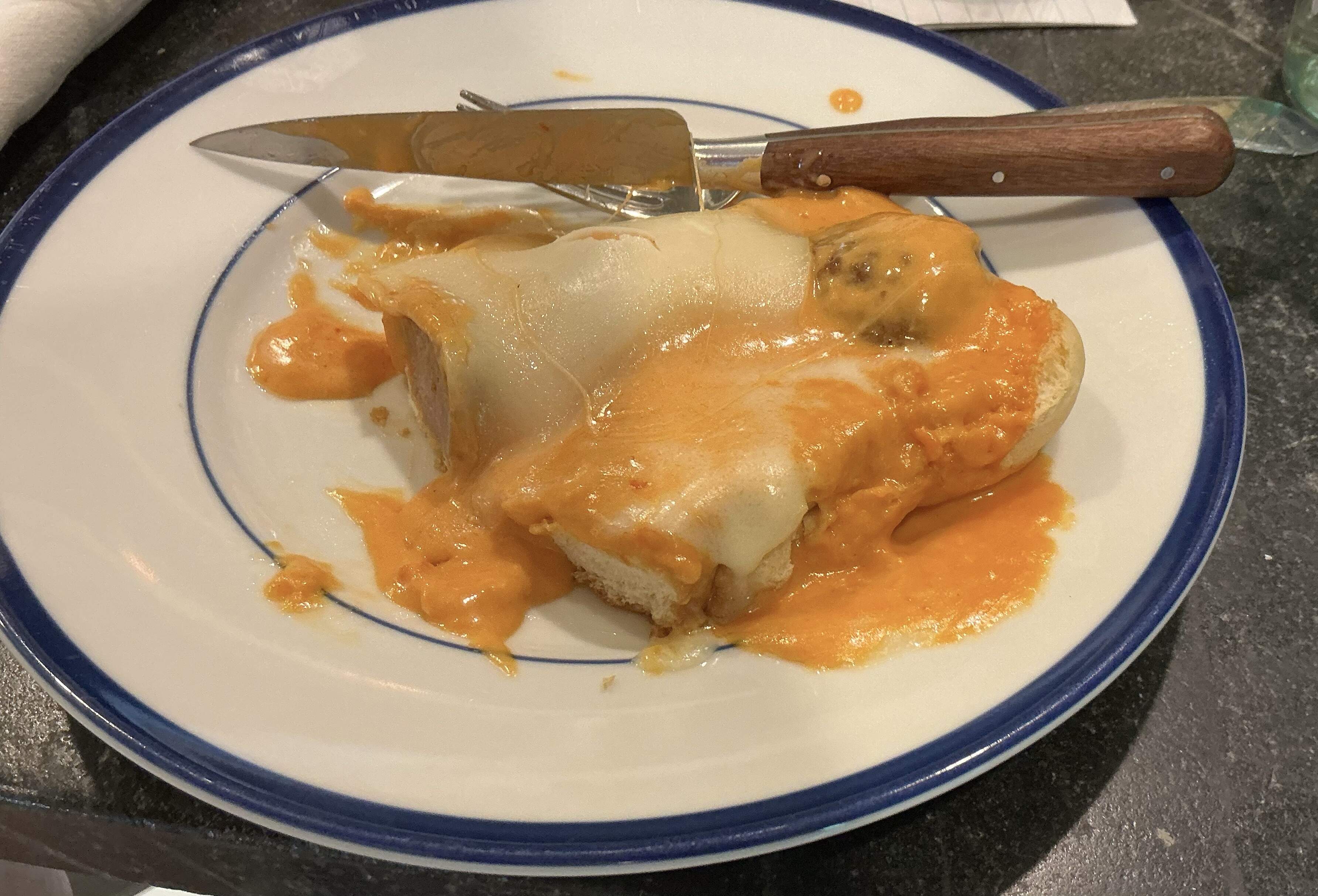 Pork meatballs, leftover vodka sauce, and provolone stagianato on a low carb Higher Harvest hot dog bun.