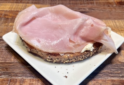 Hang sangueech con Wegners’ jamón de fiesta, local garlic & herb cream cheese, on fancy toasted WF seedy bread.