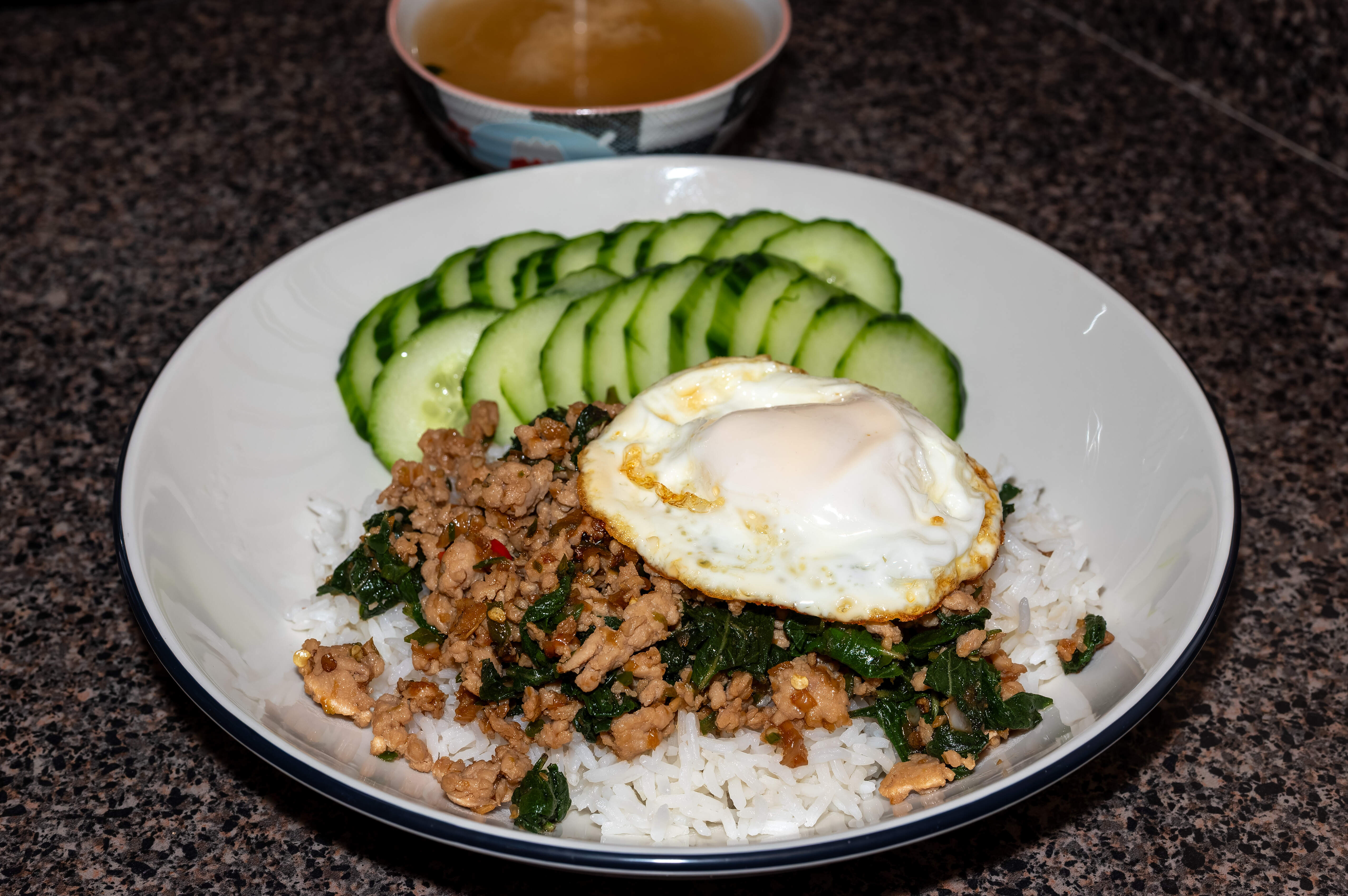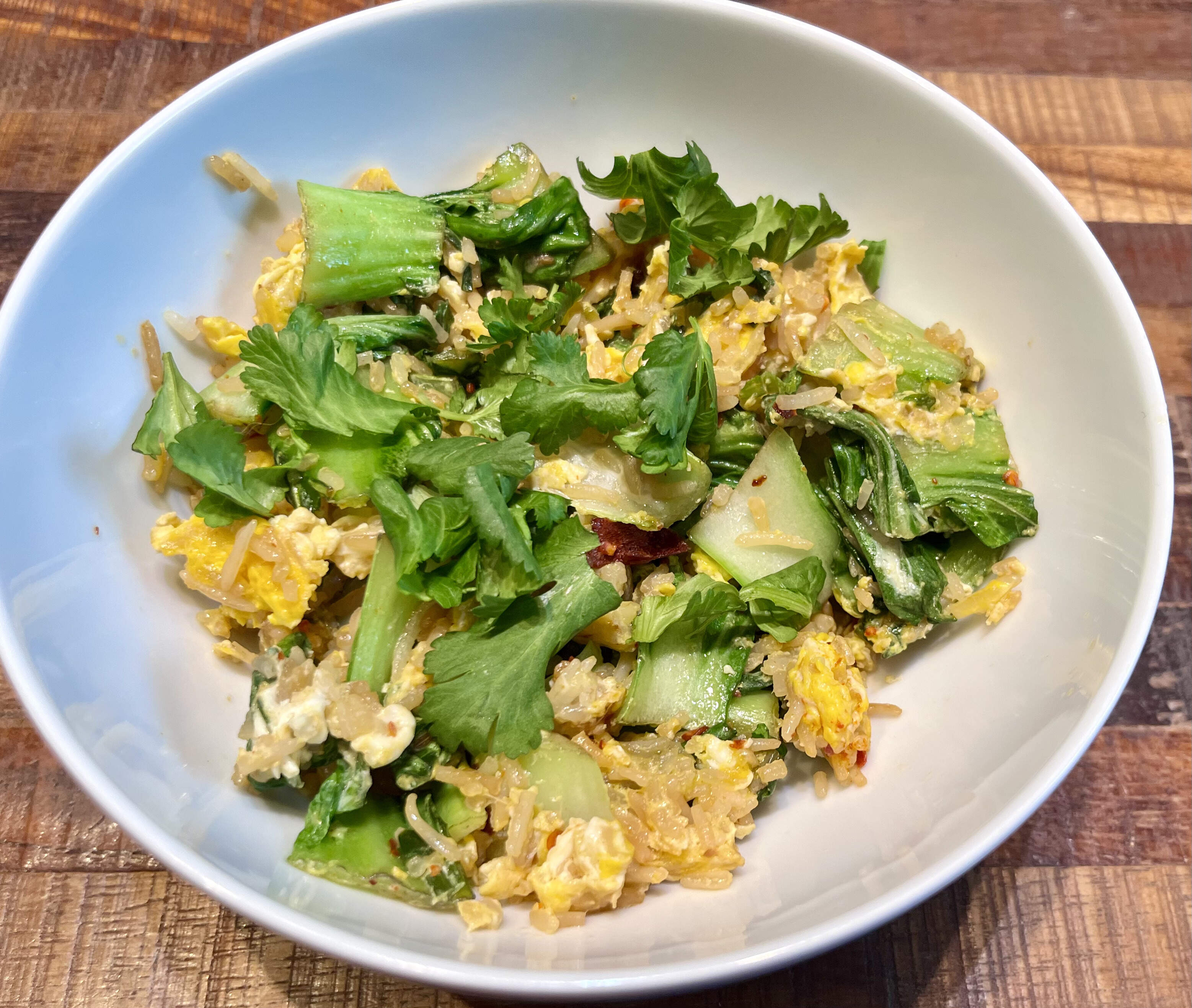 The last of the garlic rice, ancient baby bok choy leaves, and an egg bc eggses make it a meal. Sinatra on top.