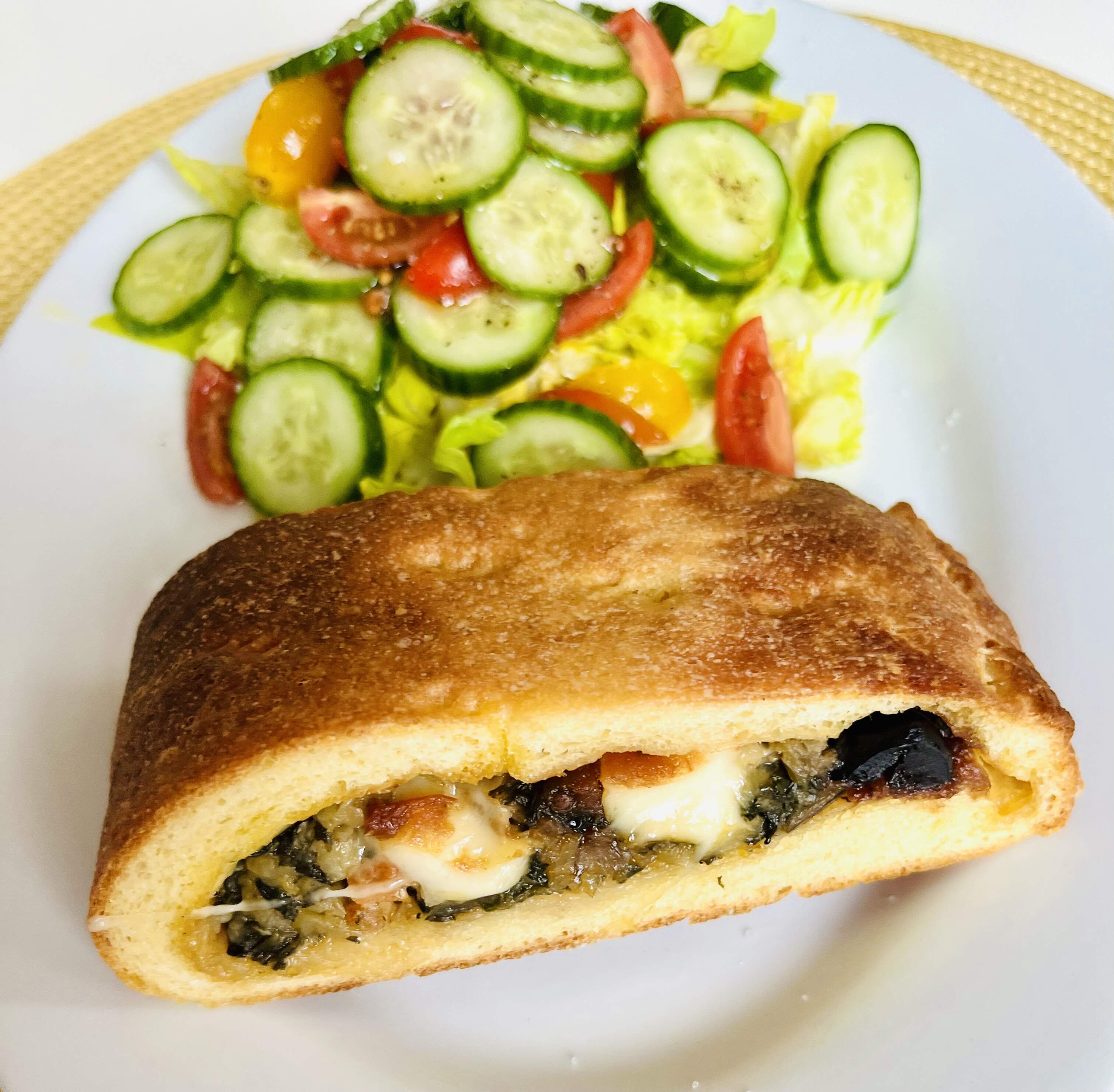 Comin’ around again…a slice of yesterday’s onion, veg, mozz pie; Little Gem lettuce, tomatoes and cuc salad.