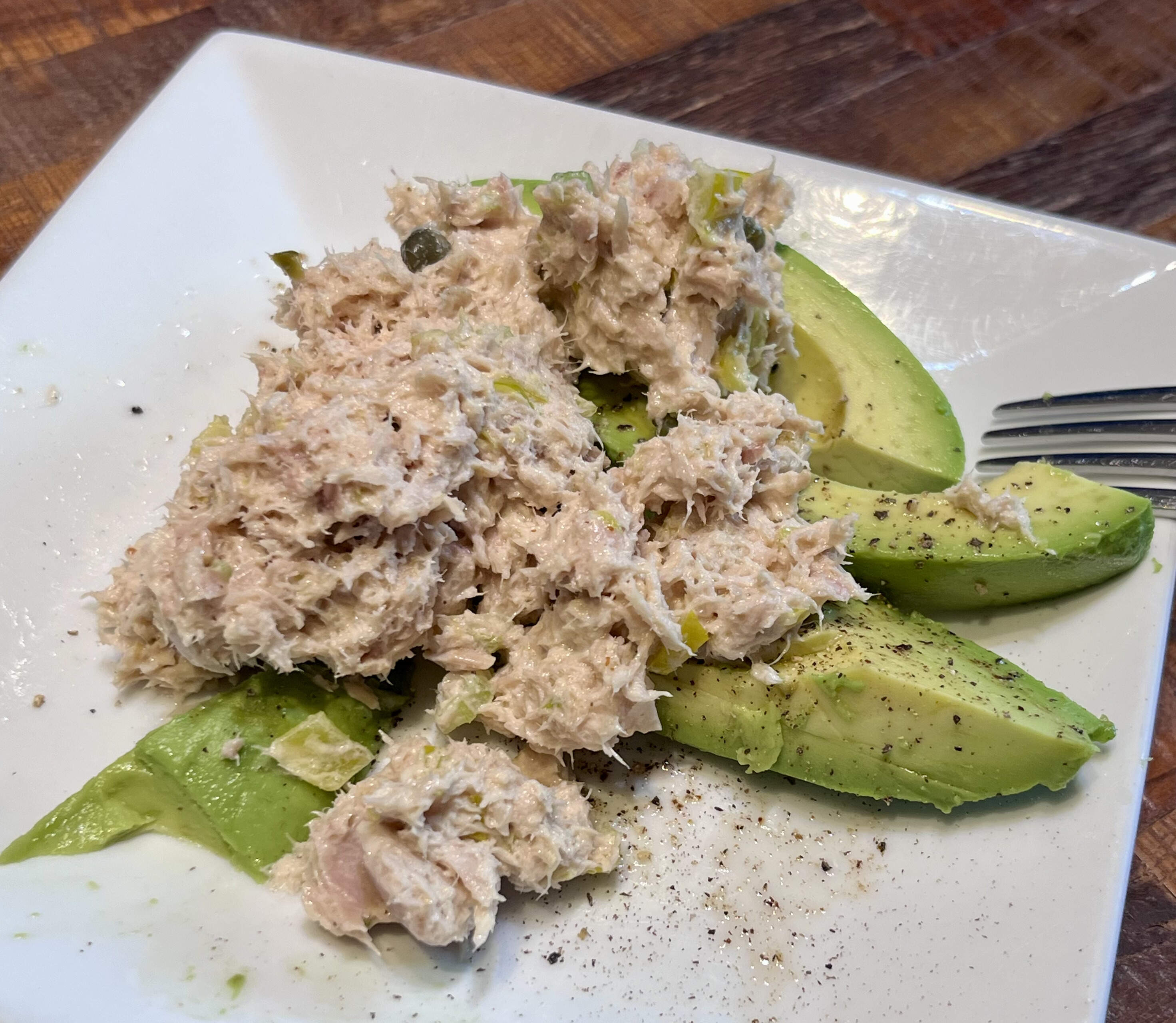 Post workout lonch: half an avocado and tuna salad w/capers, peperoncini, fennel fronds.